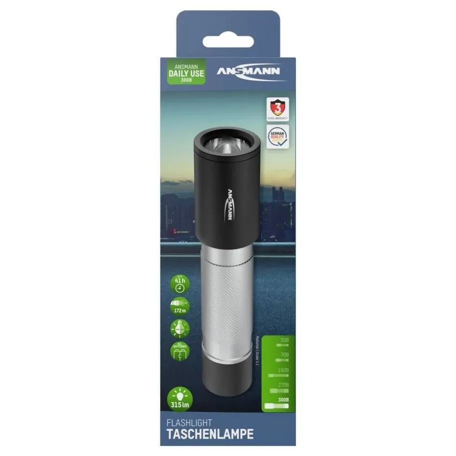 Ontworpen voor dagelijks gebruik de naam is programma – de Ansmann Daily Use 300B in hoogwaardige kwaliteit brengt altijd licht in de duisternis. De zaklamp is ontwikkeld voor een breed toepassingsgebied en is daarmee een onmisbare metgezel in het dagelijks leven. Voor huishoudelijk gebruik, zoals een keldergang, een avondwandeling, bij stroomuitval, voor het verlichten van donkere hoeken en ruimtes, bij het opruimen, renoveren, bij het verplaatsen om op u te wijzen of bij veel andere gelegenheden – de Daily Use 300B is uw zaklamp. Compact en superhelder de compacte is zo klein dat deze gegarandeerd overal plaats vindt – in de handtas, in de gereedschapskoffer of in de stuurtas van de fiets. Ondanks de geringe afmetingen en het lichte gewicht is deze krachtige stamlamp verbazingwekkend helder: Voor de maximale lichtopbrengst is de Power-LED van een optisch reflectorsysteem voorzien, dat het licht optimaal bundelt. Hierdoor wordt een helderheid van en een lichtbereik van bereikt. Praktisch & goed het energieverbruik van de Daily Use 300B zaklamp is verbazingwekkend laag. De energiebron (2x baby C / LR14 batterijen – meegeleverd) levert tot licht. De behuizing bestaat uit zeer robuust vliegtuigaluminium en zit ook stof, schokken en vallen van grote hoogte losjes weg. De levering vindt plaats in de set inclusief Ansmann alkalinebatterijen en draaglus.