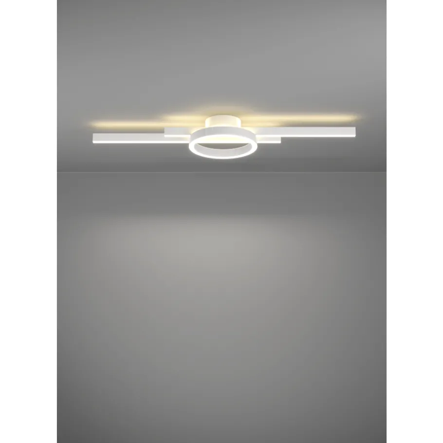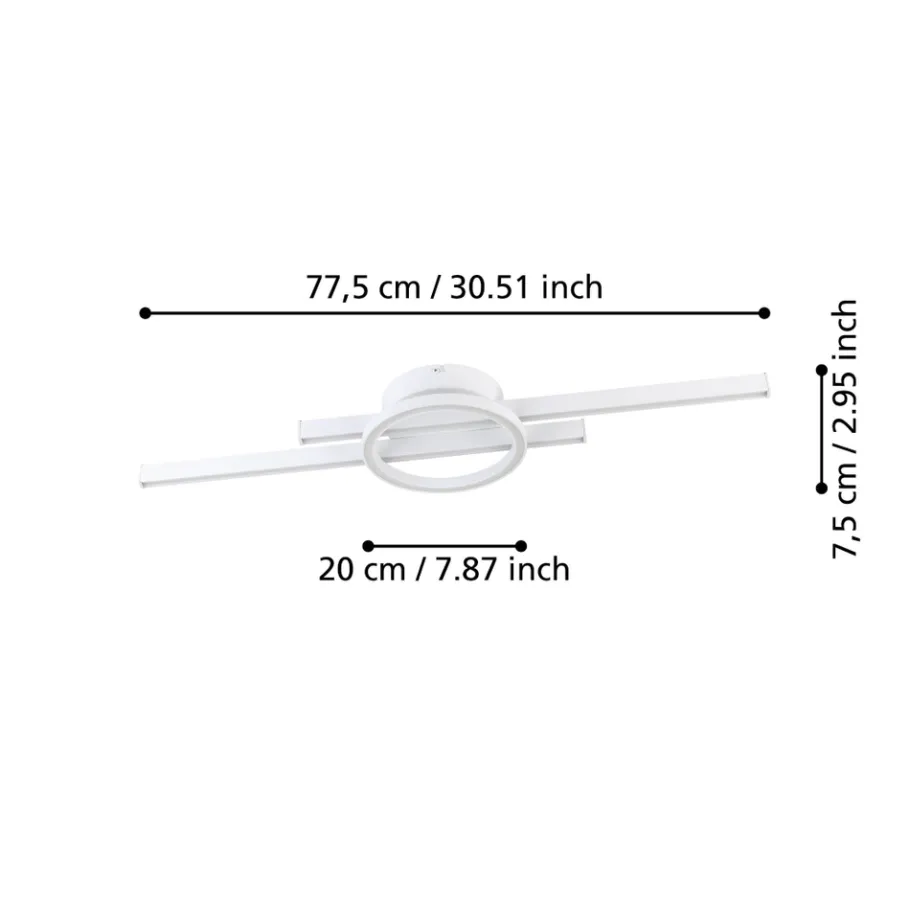 Deze Amandolo plafondlamp is gemaakt van wit aluminium, wit staal en witte kunststof. Hij meet 77cm x 24cm x 6,5cm. De geïntegreerde LED lichtbron heeft RGB licht, alsook regelbaar wit licht naar wens. De lichtstroom bedraagt maximaal 3000 lumen, maar is dimbaar. Afstandsbediening inclusief.