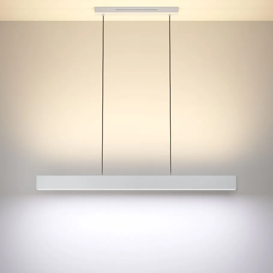 De LED hanglamp ANDREAS-Z maakt deel uit van de connect.z productlijn. De Smart hanglamp heeft een lineair wit stalen lichaam met een witte kunststof diffuser, opgehangen aan een baldakijn in dezelfde kleur. De geïntegreerde LED’s produceren een regelbaar licht dat naar wens kan worden aangepast. Je kunt kiezen uit warm wit, neutraal wit en koel wit licht, en een breed scala aan RGB-kleuren. Het licht kan worden bediend met een gratis app (AwoX HomeControl), die ook andere functies biedt zoals helderheidsaanpassing, timerbediening, aanwezigheidssimulatie en nog veel meer. Het product maakt gebruik van Bluetooth en ZigBee 3.0 en kan ook worden bediend met compatibele spraakassistenten. De hanglamp kan ook bediend worden met een afstandsbediening, die apart verkrijgbaar is. Met een minimalistisch ontwerp past de lamp naadloos in moderne interieurs en biedt stijlvolle verlichting voor elke ruimte, of het nu in de woonkamer is of boven de eetkamertafel.