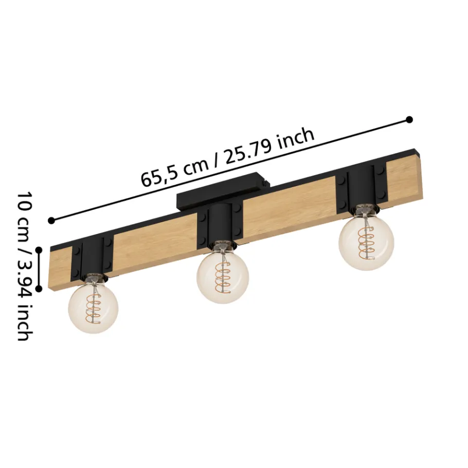 Deze BAILRIGG plafondlamp heeft een zwarte metalen voet met daaraan een houten balkje met drie lichtbronnen. Het zwarte staal vult de moderne maar natuurlijke uitstraling van het hout aan en past naadloos in een modern interieur. De lamp biedt gezellige verlichting voor elke ruimte, zowel op in de woonkamer, de hal als de keuken. Het product vereist drie E27 lichtbronnen die niet zijn inbegrepen.