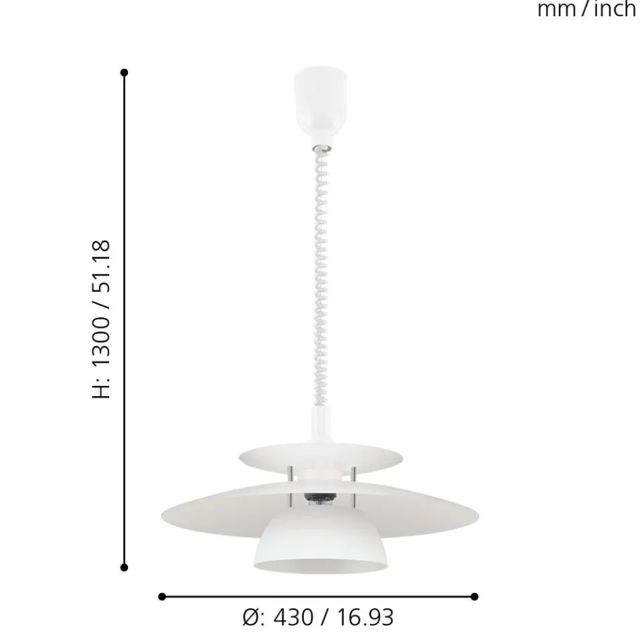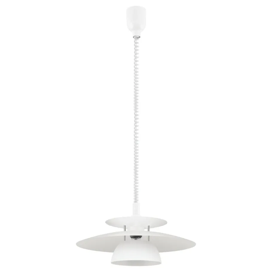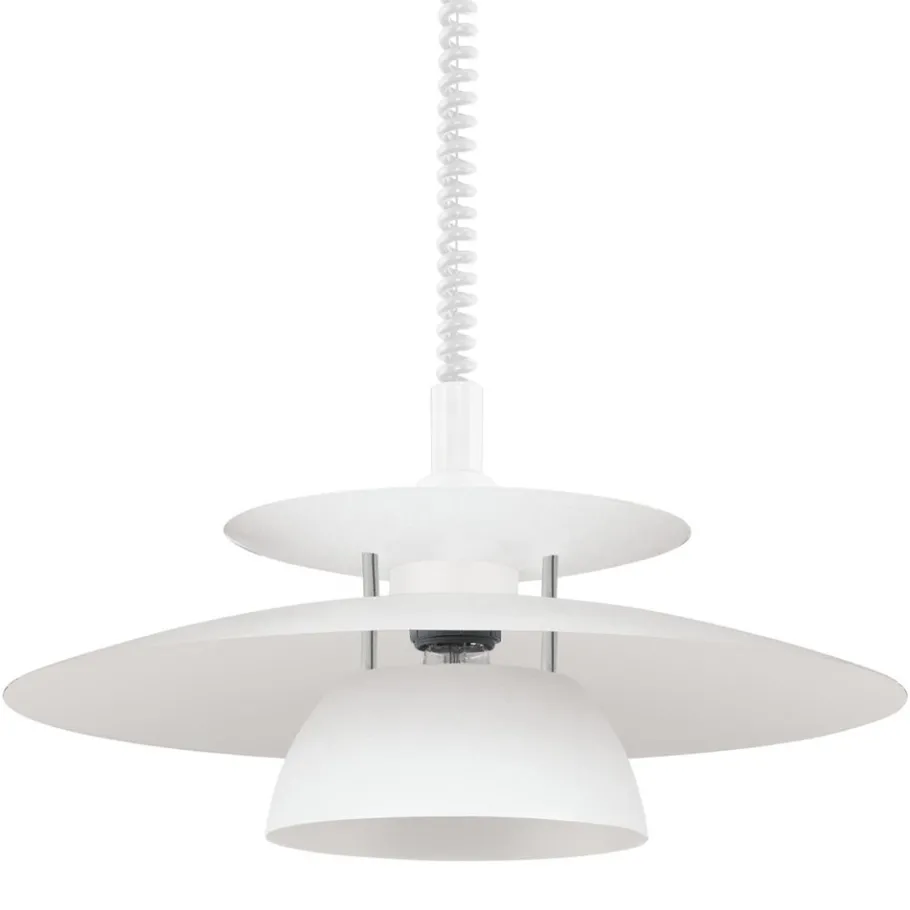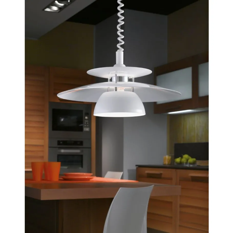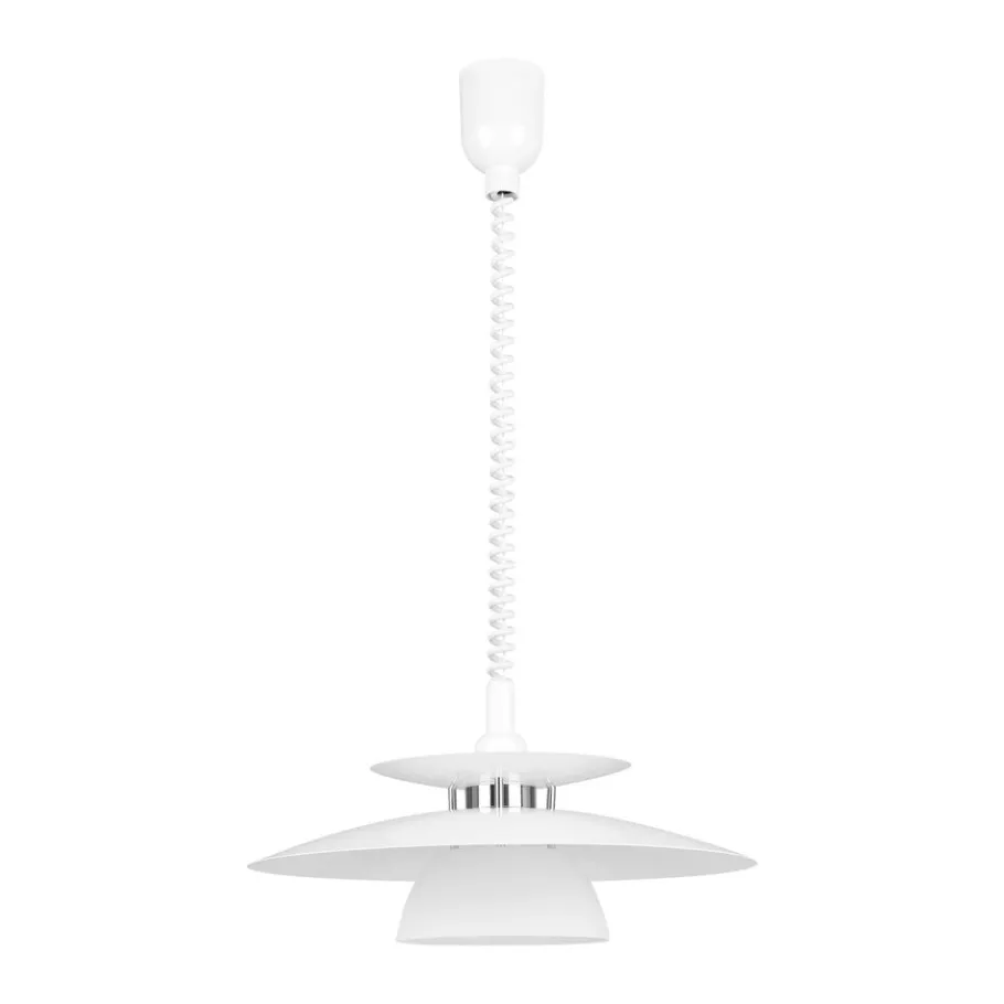 De hanglamp BRENDA is gemaakt van wit metaal en bestaat uit twee in elkaar grijpende kappen. Dankzij haar speciale vorm straalt de armatuur niet alleen naar beneden maar ook centraal en zorgt ze voor een goede verlichting en een aangename sfeer. Hij kan ook in hoogte worden versteld door middel van de spiraalkabel. Het futuristische ontwerp van de hanglamp past perfect in moderne interieurs en wordt benadrukt door de chromen details van het verlichtingslichaam. Hij zorgt voor stijlvolle verlichting in de keuken of eetkamer boven de tafel. De lichtbron is niet inbegrepen. De armatuur is compatibel met elke E27-lichtbron.