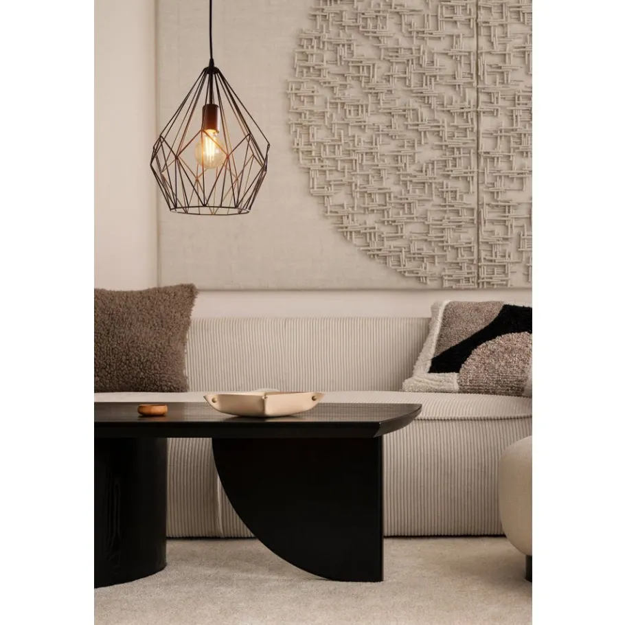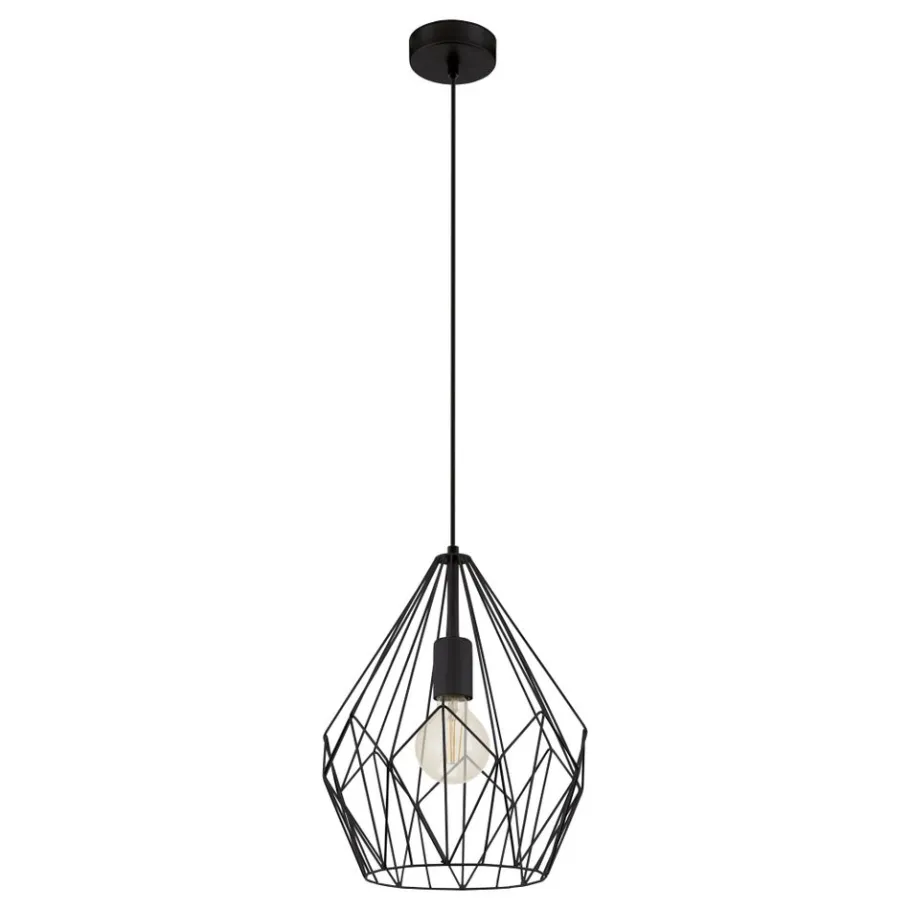 De CARLTON hanglamp bestaat uit een zwart draadlichaam in de vorm van een diamant. De draadkap creëert een prachtig spel van licht en schaduw op de muur zodra het licht wordt ingeschakeld. De hanger past in moderne interieurs in vintage stijl en is geschikt voor elke ruimte, of het nu de keuken, woonkamer of eetkamer is, boven de tafel. De afgebeelde lichtbron is niet inbegrepen. De armatuur is compatibel met elke E27 lamp.