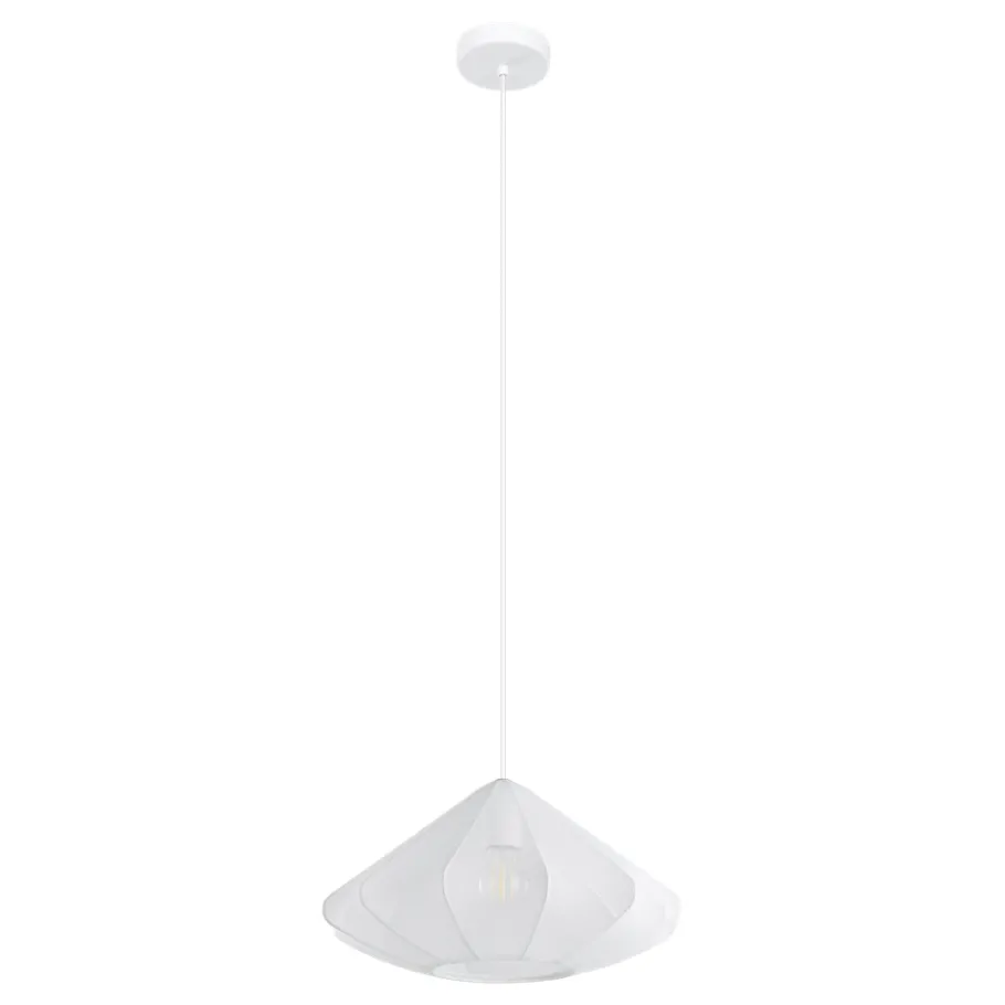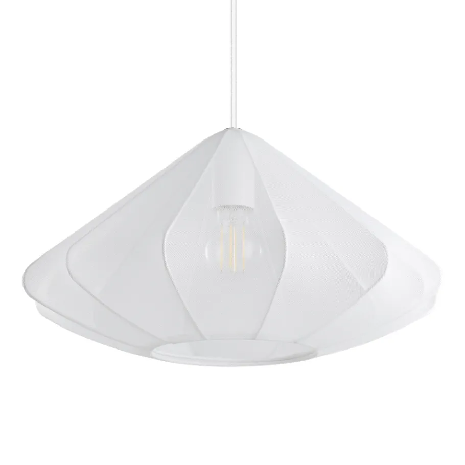 Deze DOLWEN hanglamp is gemaakt van wit staal met een kap van 42 cm diameter bekleed in doorschijnende mesh stof. Hierdoor geeft het een inkijk in de E27 fitting waar een heel mooie warme lichtbron in zou passen (niet inbegrepen). Door zijn open vorm en industriële look past deze perfect in een moderne huiskamer of strakke slaapkamer.