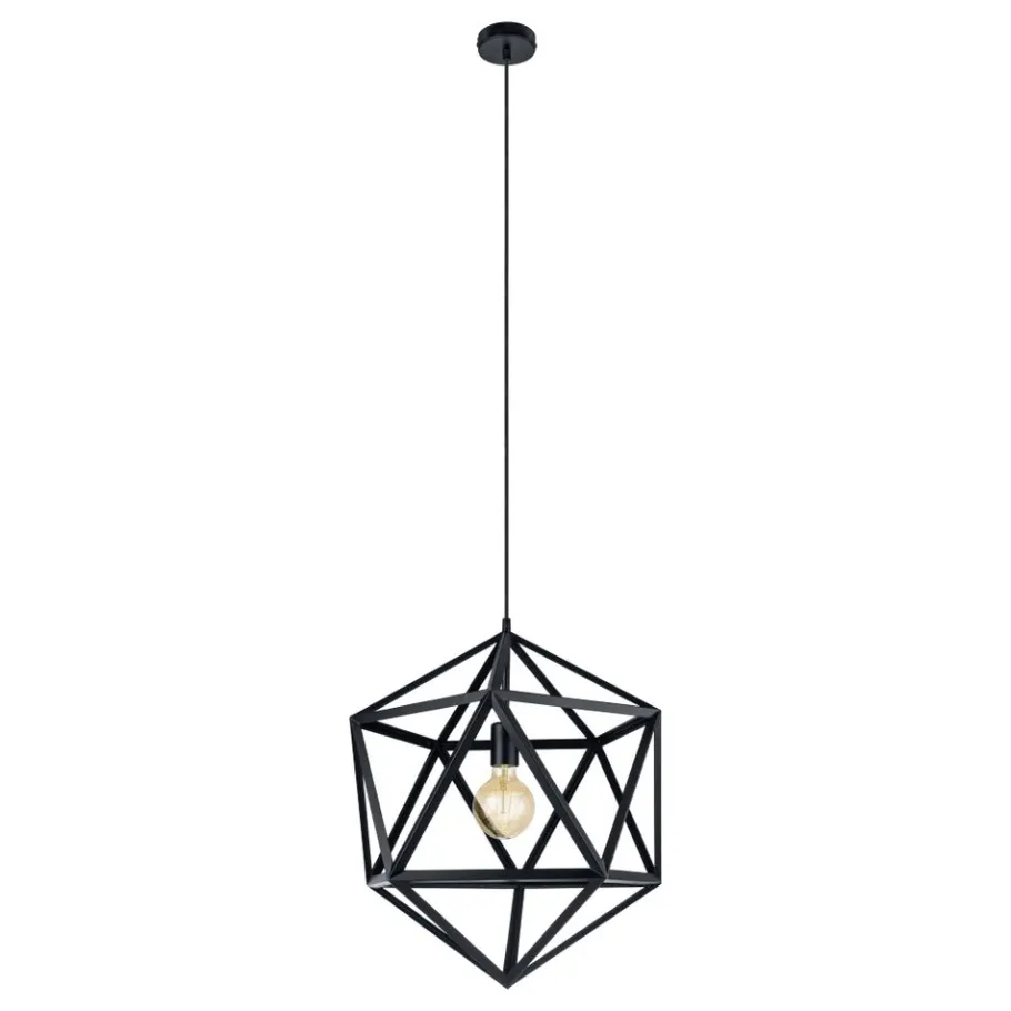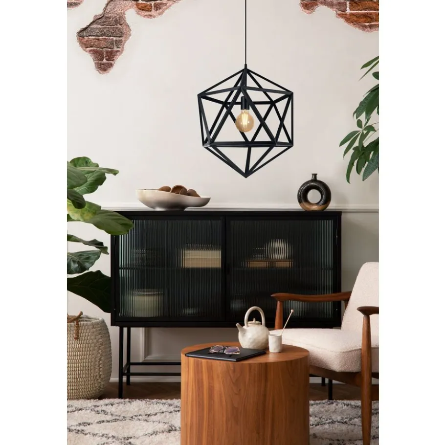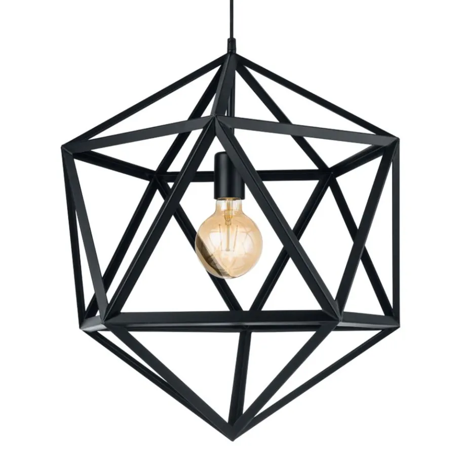 De EMBLETON hanglamp bestaat uit een zwarte metalen kap in de vorm van een diamant met een zichtbare fitting. Het metalen frame van de lampenkap creëert een prachtig spel van licht en schaduw op de muur zodra het licht wordt ingeschakeld. Deze hanger past perfect in interieurs in industriële stijl. Het biedt unieke verlichting in elke kamer, of het nu in de woonkamer is of in de eetkamer boven de tafel. De afgebeelde lichtbron is niet inbegrepen. De armatuur is compatibel met elke E27 lamp.