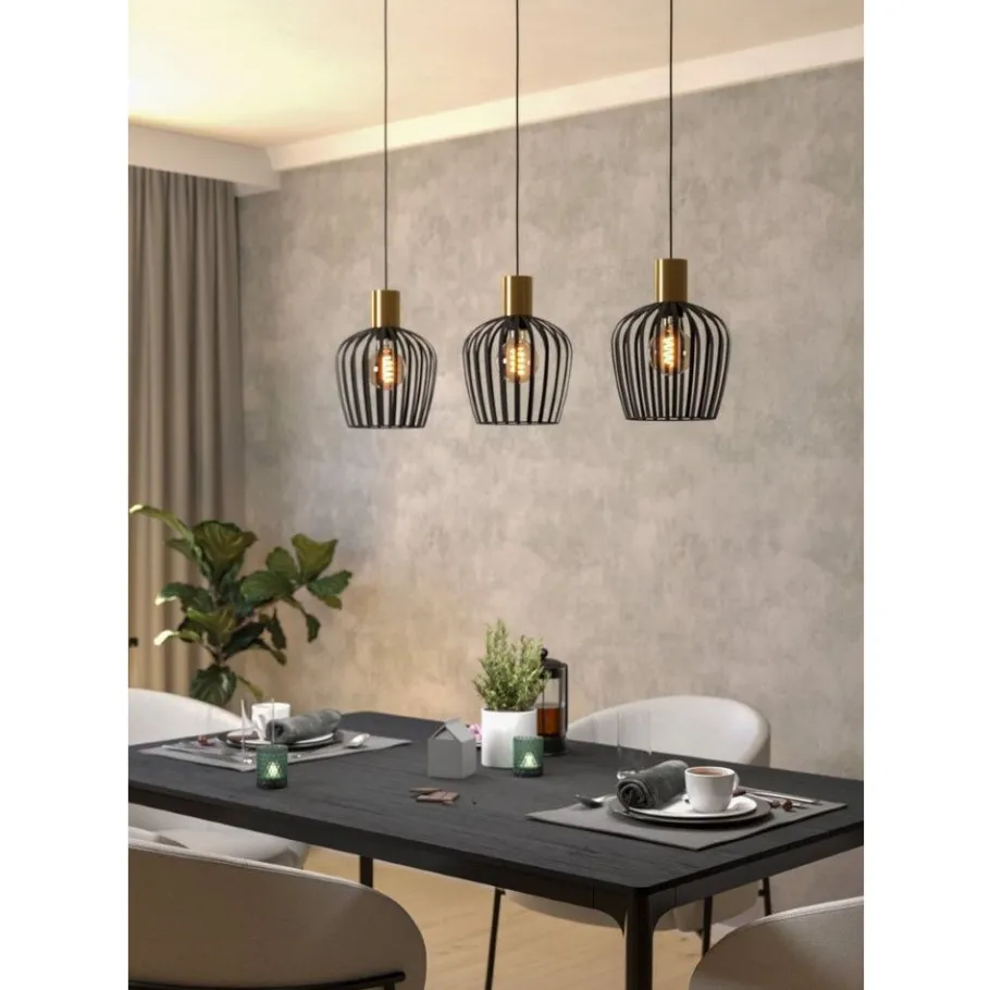 De stoere EMPOLI hanglamp met zwart stalen frame en fitting in messing geeft dé nodige touch aan je woning. Deze hanglamp is exclusief drie E27 lichtbronnen.