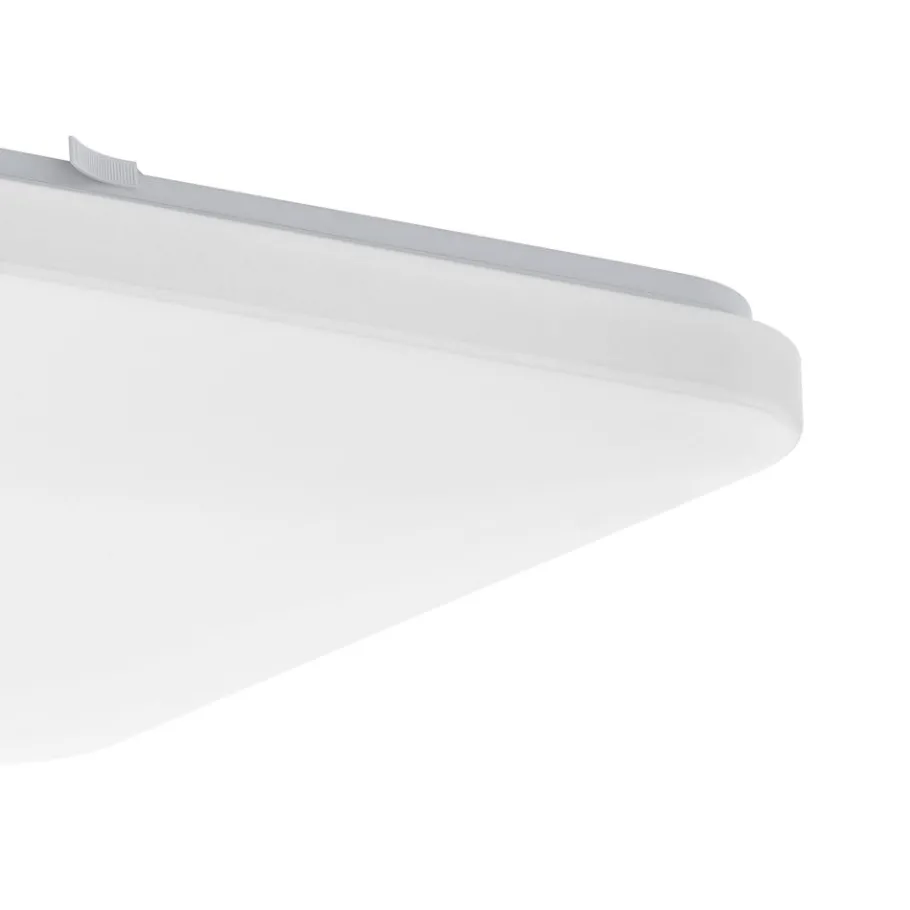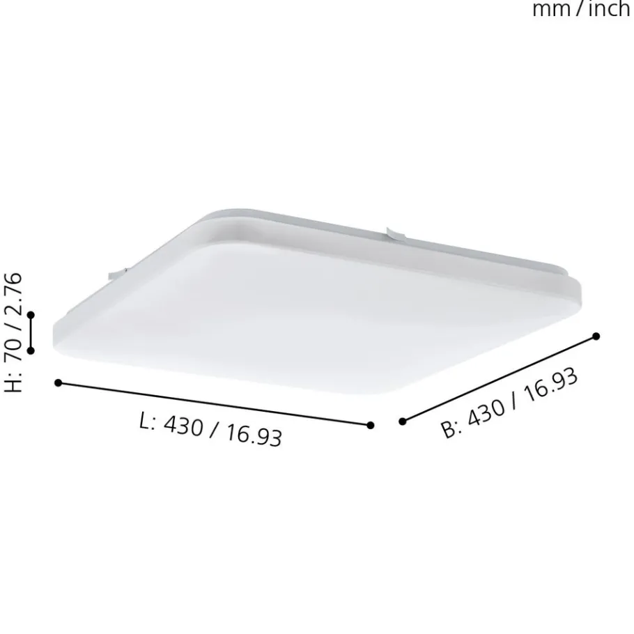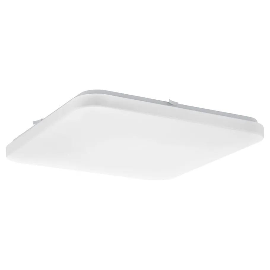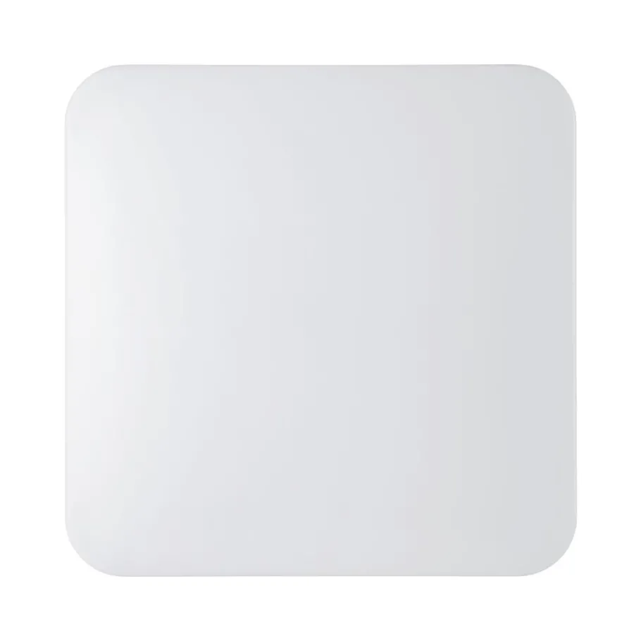 De LED-plafondlamp FRANIA bestaat uit een vierkante witte kunststof kap met afgeronde hoeken en een wit metalen achterzijde. De geïntegreerde LEDs geven een aangenaam warm wit licht. De eenvoudige plafondlamp met een afmeting van 43 x 43 cm biedt tijdloze verlichting en past perfect in moderne interieurs, bijvoorbeeld in de keuken, woonkamer, slaapkamer of hal.