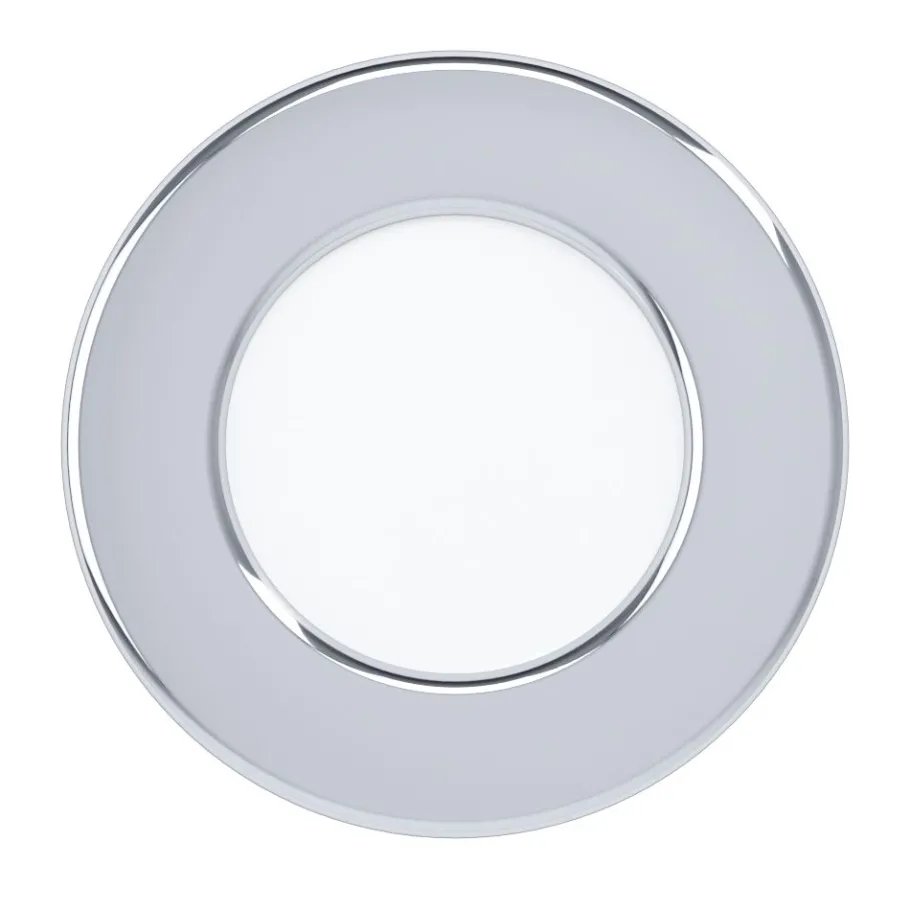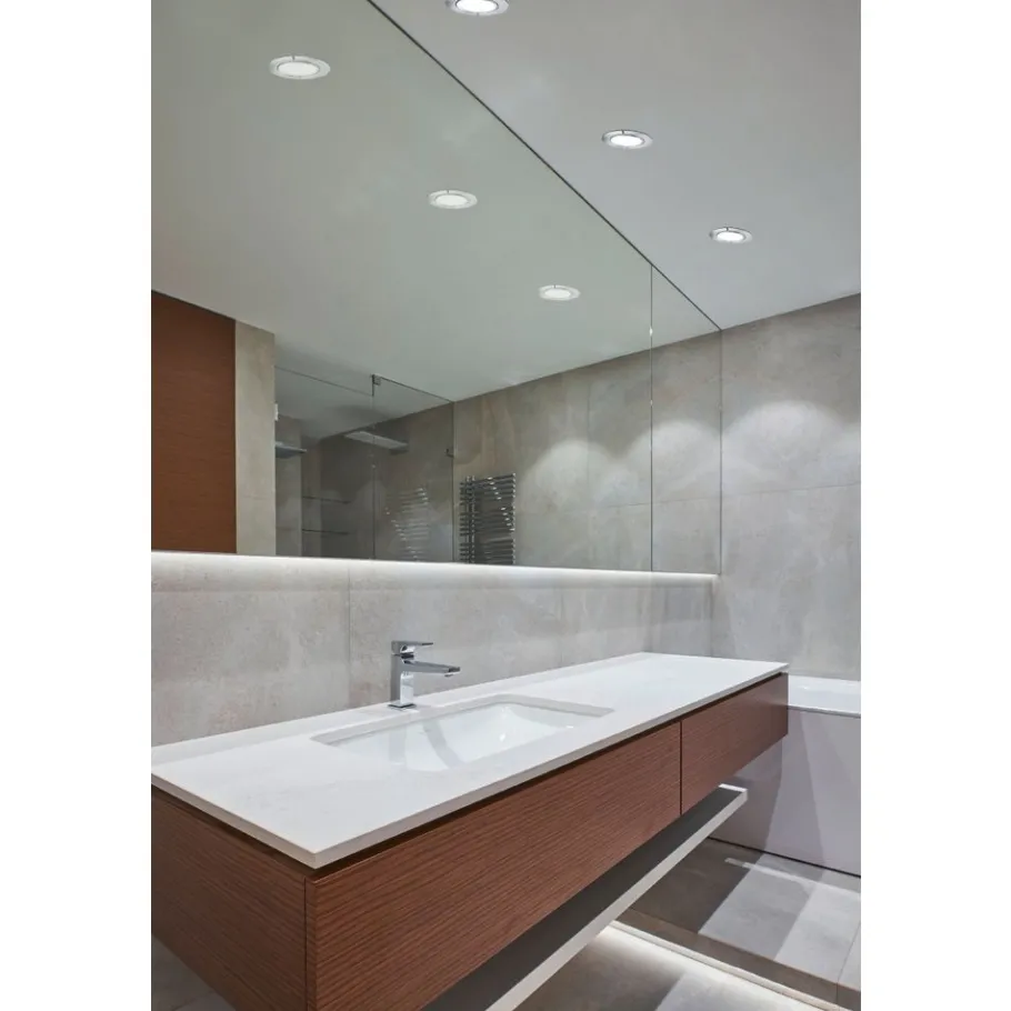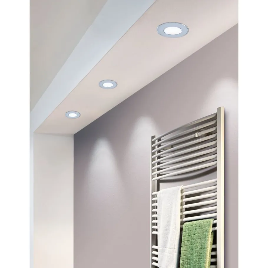 De LED-inbouwarmatuur FUEVA 5 met een diameter van 86 mm is vervaardigd uit verchroomd metaal. Dankzij de zeer geringe inbouwdiepte van slechts 26 mm past het perfect in elk interieur en kan het ook in isolatie worden ingebouwd. Dankzij de spatwaterdichtheid (IP44) kan de armatuur zonder angst in de badkamer worden gebruikt. De geïntegreerde LEDs stralen een aangenaam warm wit licht uit en blijven onzichtbaar dankzij de witte diffuser. Voor inbouwmontage is een uitsparing van 75 mm diameter vereist. Dankzij het tijdloze ontwerp van deze inbouwspot kan hij in elke ruimte worden gebruikt, of het nu gaat om de badkamer, keuken, woonkamer, slaapkamer, hal of eetkamer.