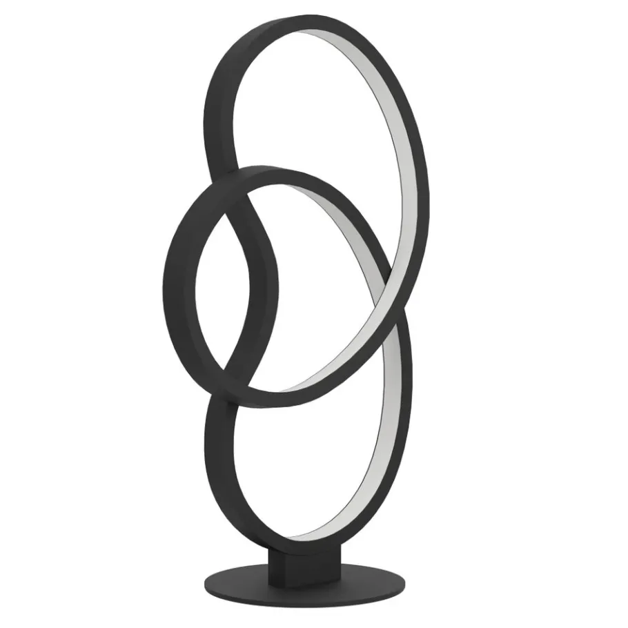 Deze GIANELLA tafellamp is gemaakt van drie ineenlopende cirkels van zwart staal en aluminium en geïntegreerde witte LEDs in kunststof. De lamp brengt een sfeervol warm wit licht van 1100 lumen. Ideaal voor in de slaapkamer of woonkamer.