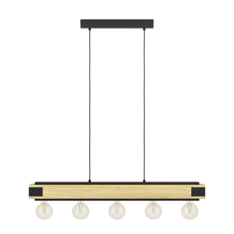 De hanglamp LAYHAM is gemaakt van zwart metaal met gevlamde houten zijkappen en vijf fittingen. Deze hanger past perfect in de vintage of industriële trend en biedt unieke, opvallende verlichting in elke kamer, of het nu de woonkamer is of de eetkamer, bijvoorbeeld boven een lange tafel. De afgebeelde lichtbronnen zijn niet inbegrepen. De armatuur is compatibel met elke E27 lamp.
