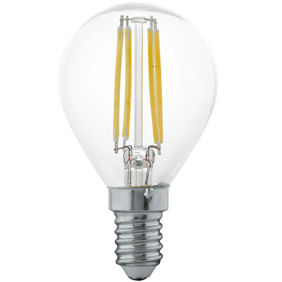 De E14 LED lamp met zichtbaar filament is gemaakt van helder glas. De klassieke 4 Watt LED lamp (P45) verspreidt een aangenaam warm wit licht van 350 lumen.