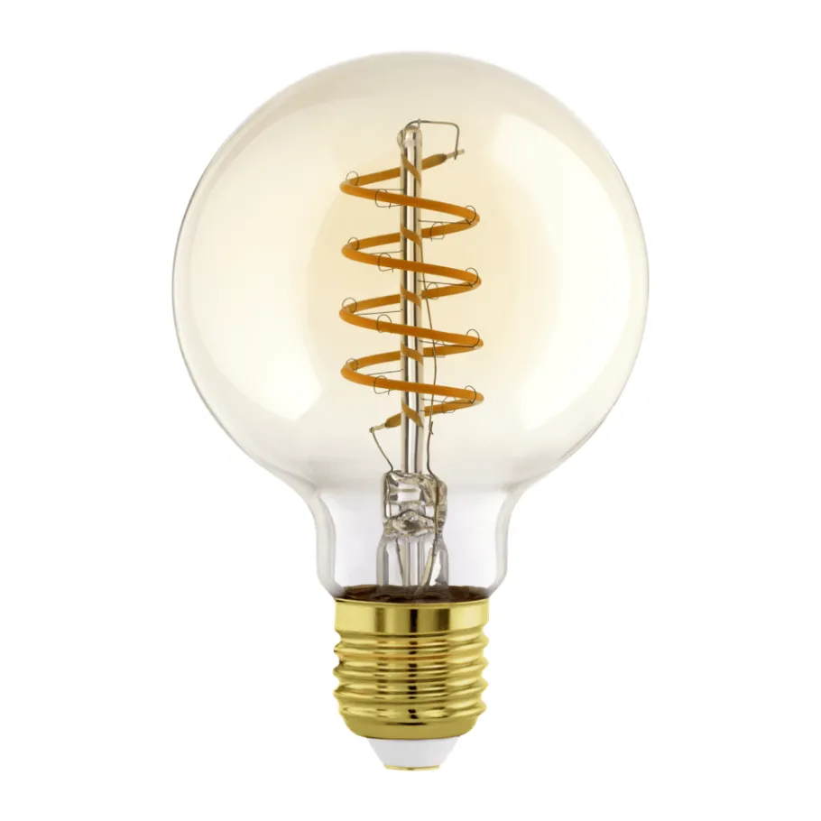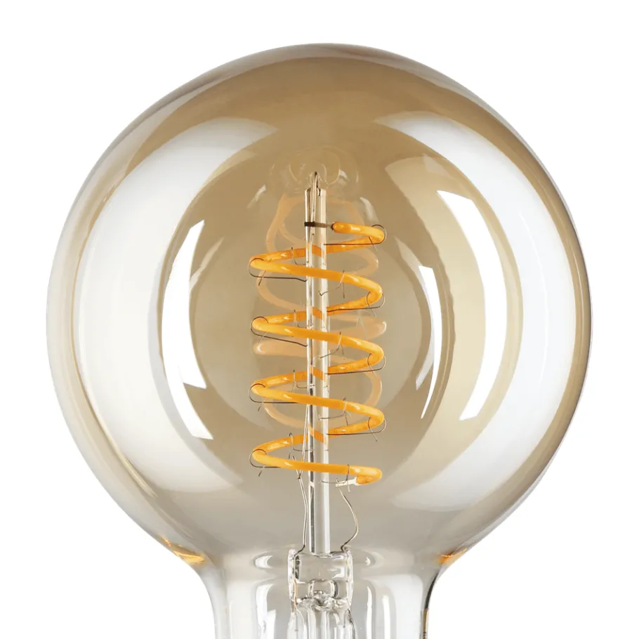 De E27 LED lichtbron is gemaakt van amberkleurig glas met spiraalvormige LEDs. De 4 Watt LED lamp (G95) geeft een aangenaam warm wit licht van 245 lumen en kan gedimd worden (afhankelijk van de dim eigenschappen van het armatuur). Dankzij het gouden effect in een trendy vintage design kan deze LED globe lamp ook perfect in het zicht hangen en zal ze een blikvanger zijn in elke kamer.