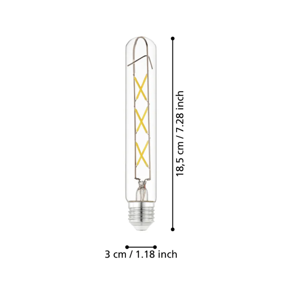 De E27 LED lamp met zichtbaar filament is gemaakt van helder glas. De klassieke lange 4 Watt LED lamp (T30) geeft een aangenaam warm wit licht van 470 lumen. Dankzij zijn slanke vorm kan deze LED lamp ook perfect gebruikt worden in een smalle armatuur en zal hij een blikvanger zijn in elke kamer.