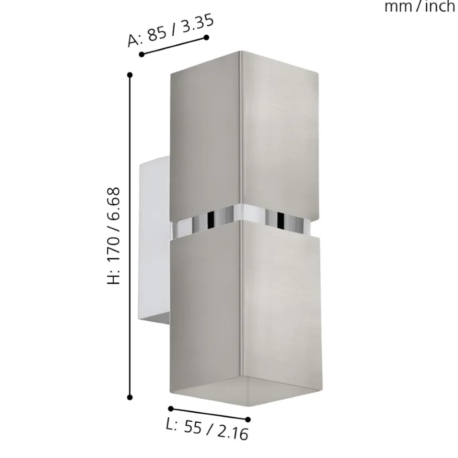 De LED-wandlamp PASSA bestaat uit een kubusvormig lichtlichaam in mat nikkel en een verchroomde metalen wandhouder. De meegeleverde GU10 LED-lampen geven een aangenaam warm wit licht en creëren een indirecte verlichting op de muur dankzij het boven- en onderlichtingssysteem. Met haar moderne, minimalistische ontwerp past deze wandlamp in verschillende kamers, of het nu in de woonkamer, slaapkamer, eetkamer of hal is.