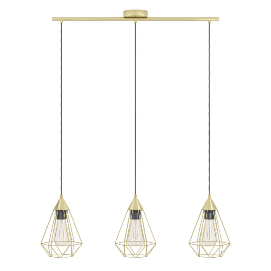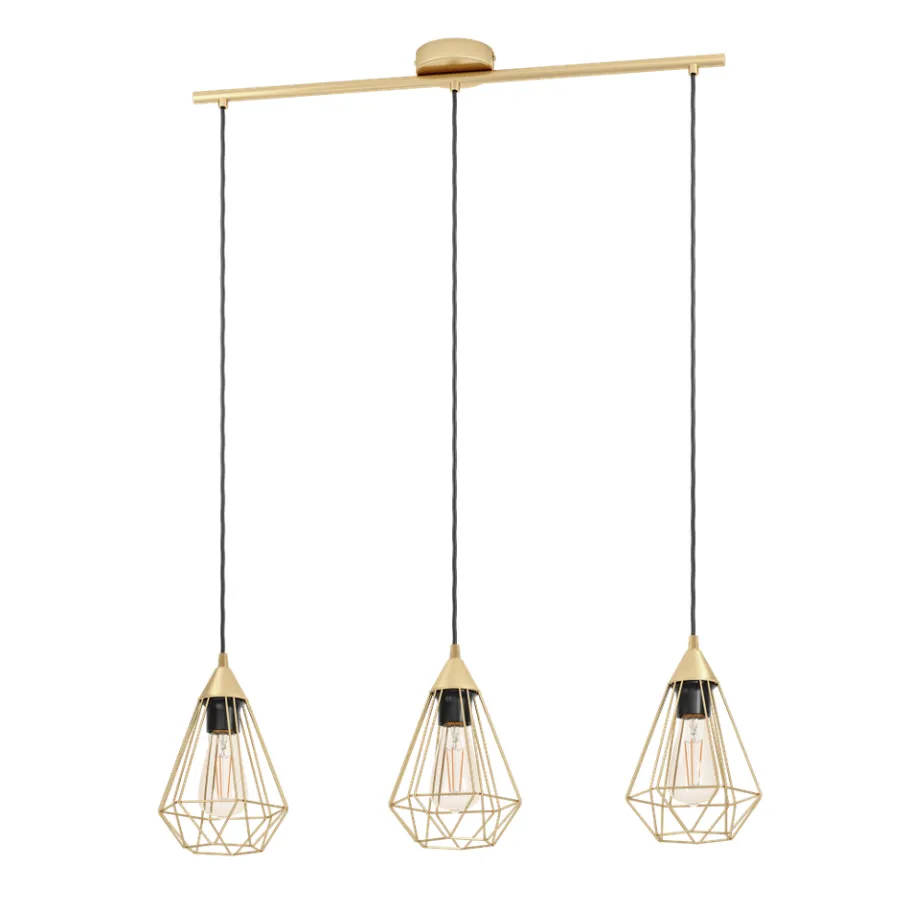De TARBES-hanglamp bestaat uit drie filigraan ruitvormige kappen van geborsteld messingdraad, gecombineerd met een langwerpige hanglamp in dezelfde kleur. De geometrische kappen creëren een fascinerend spel van licht en schaduw wanneer ze branden. De moderne hanglamp biedt elegante verlichting voor elke ruimte – of het nu in de woonkamer of eetkamer is, bijvoorbeeld boven een lange eettafel. De afgebeelde lichtbronnen worden niet meegeleverd. Het armatuur is geschikt voor alle lichtbronnen met E27 voet.