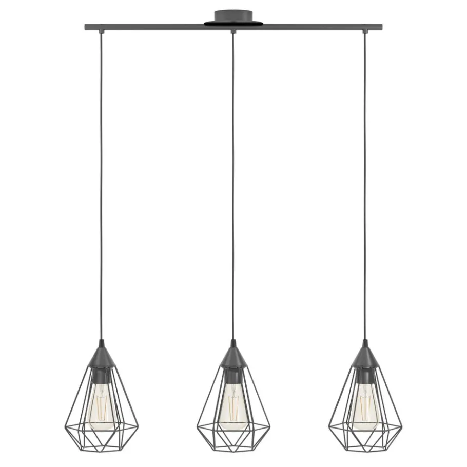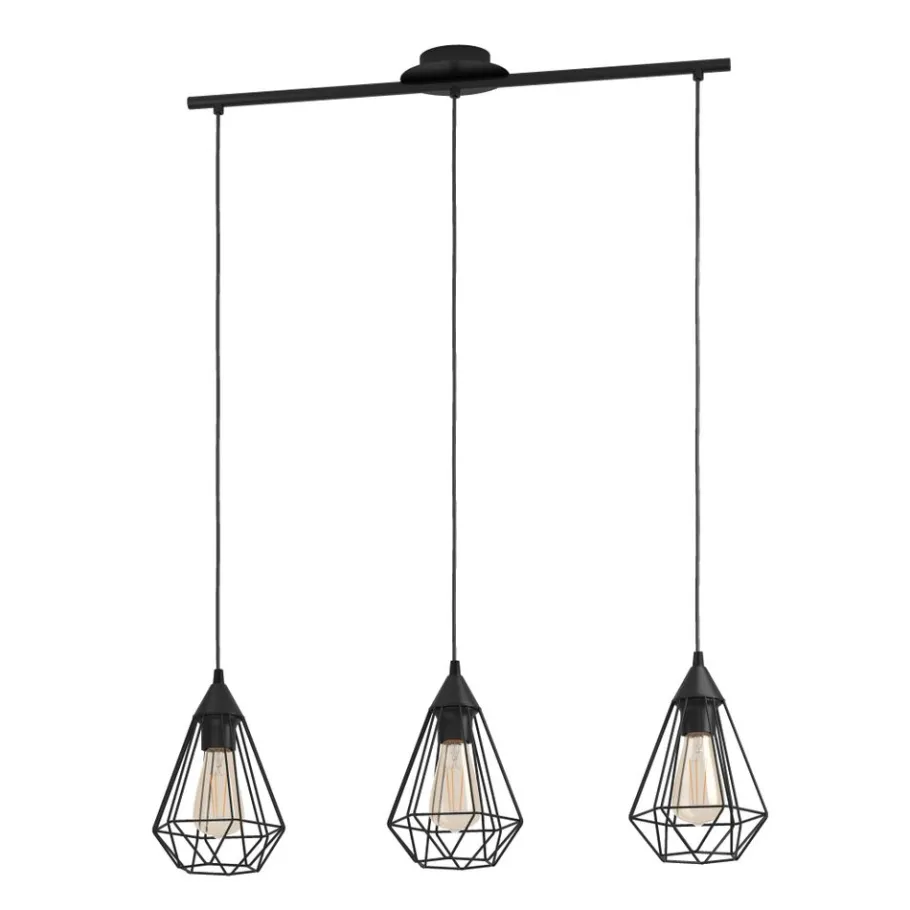 De TARBES hanglamp bestaat uit drie zwarte draadkappen in de vorm van een diamant, gecombineerd met een rechthoekige hanglamp in dezelfde kleur. Wanneer het licht wordt ingeschakeld, creëren de geometrische tinten een fascinerend spel van licht en schaduw. Deze moderne hanglamp zorgt voor stijlvolle verlichting in elke ruimte, zowel in de woonkamer als in de eetkamer, bijvoorbeeld boven een lange tafel. De afgebeelde lichtbronnen zijn niet inbegrepen. De armatuur is compatibel met elke E27 lamp.