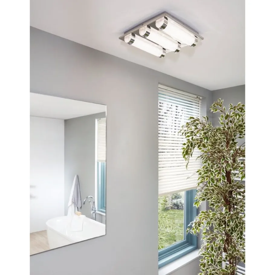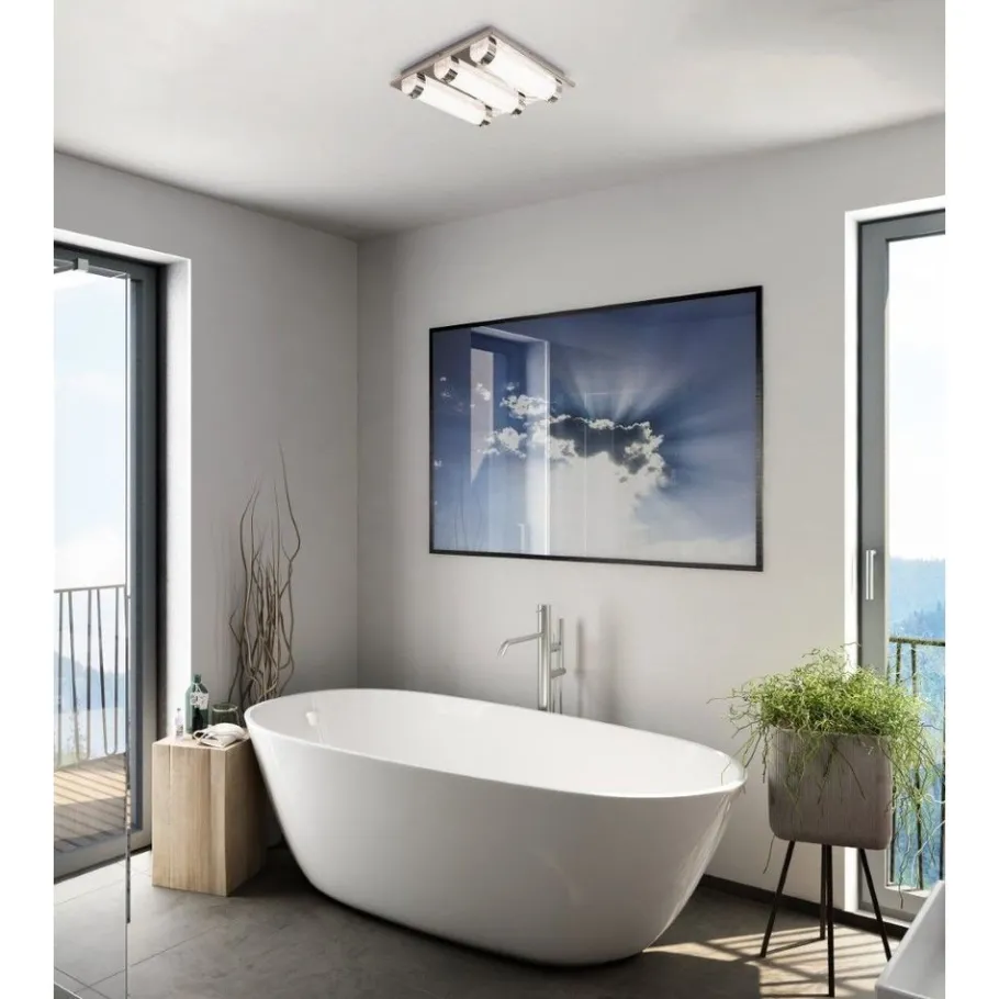 De LED plafondlamp TOLORICO bestaat uit een vierkante behuizing van verchroomd roestvrij staal in combinatie met drie transparante kunststof buizen. De geïntegreerde LEDs geven een krachtig neutraal wit licht, terwijl de granieten kristallen in de buizen een sprankelend effect geven. Dankzij de IP44 spatwaterbescherming kan de armatuur zonder problemen in de badkamer worden gebruikt. Met haar formaat van 35 x 35 cm past deze plafondlamp perfect in moderne interieurs en biedt ze stijlvolle verlichting in elke ruimte, of het nu in de badkamer, keuken of hal is.