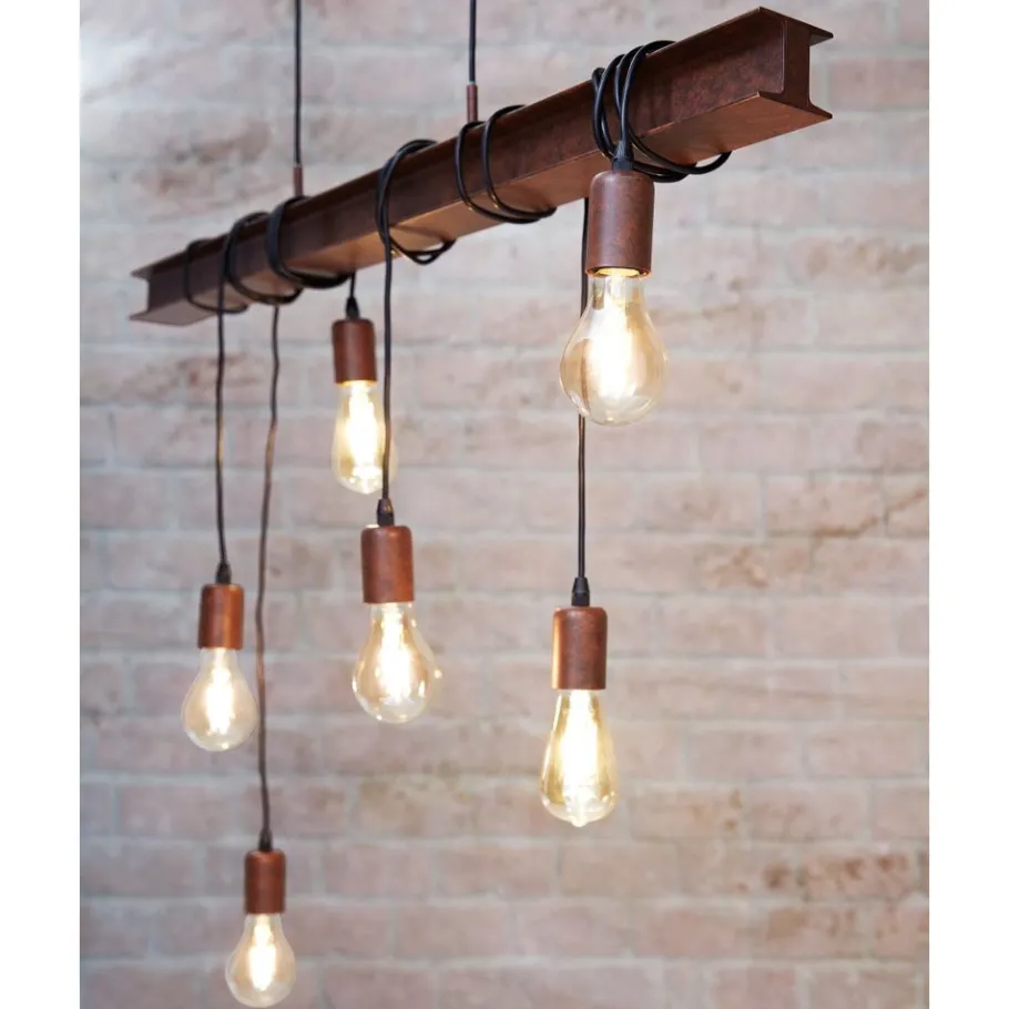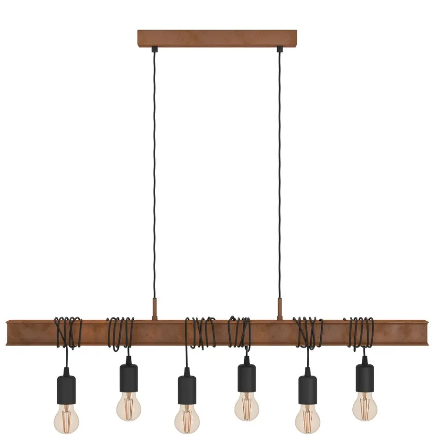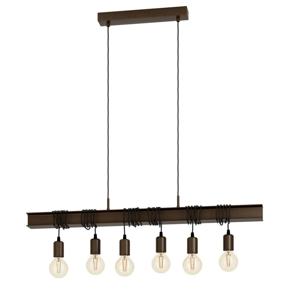 De TOWNSHEND 4 bestaat uit een roestbruine metalen staaf die lijkt op een stalen balk. De metalen staaf is gecombineerd met zes roestbruine hangmoffen, waarvan de hoogte kan worden aangepast door eenvoudigweg de kabel op te winden. De hanglamp past perfect in interieurs in vintage of industriële stijl. Het is een blikvanger in elke kamer, zowel in de woonkamer als in de eetkamer, bijvoorbeeld boven een lange tafel. De afgebeelde lichtbronnen zijn niet inbegrepen. De armatuur is compatibel met elke E27 lamp.