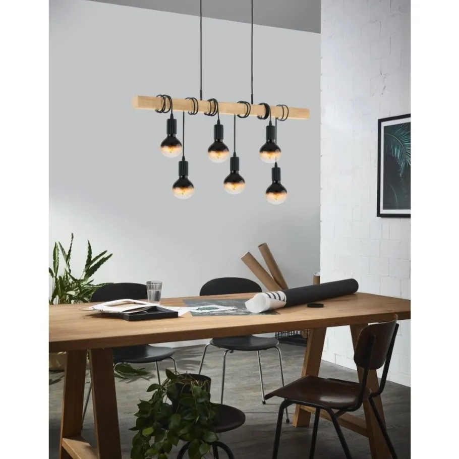 TOWNSHEND bestaat uit een houten balk gecombineerd met zes hangende zwarte struiken. Deze kunnen op verschillende hoogtes worden opgehangen dankzij een eenvoudig opwindmechanisme. De spannende mix van materialen, FSC-gecertificeerd grenen en metaal, past perfect bij de huidige trends zoals vintage en industrieel. Het biedt moderne verlichting voor elke ruimte, of het nu in de woonkamer of eetkamer is, bijvoorbeeld boven een liggende eettafel. De afgebeelde gloeilampen zijn niet inbegrepen. Het armatuur is geschikt voor alle gloeilampen met een E27 fitting.
