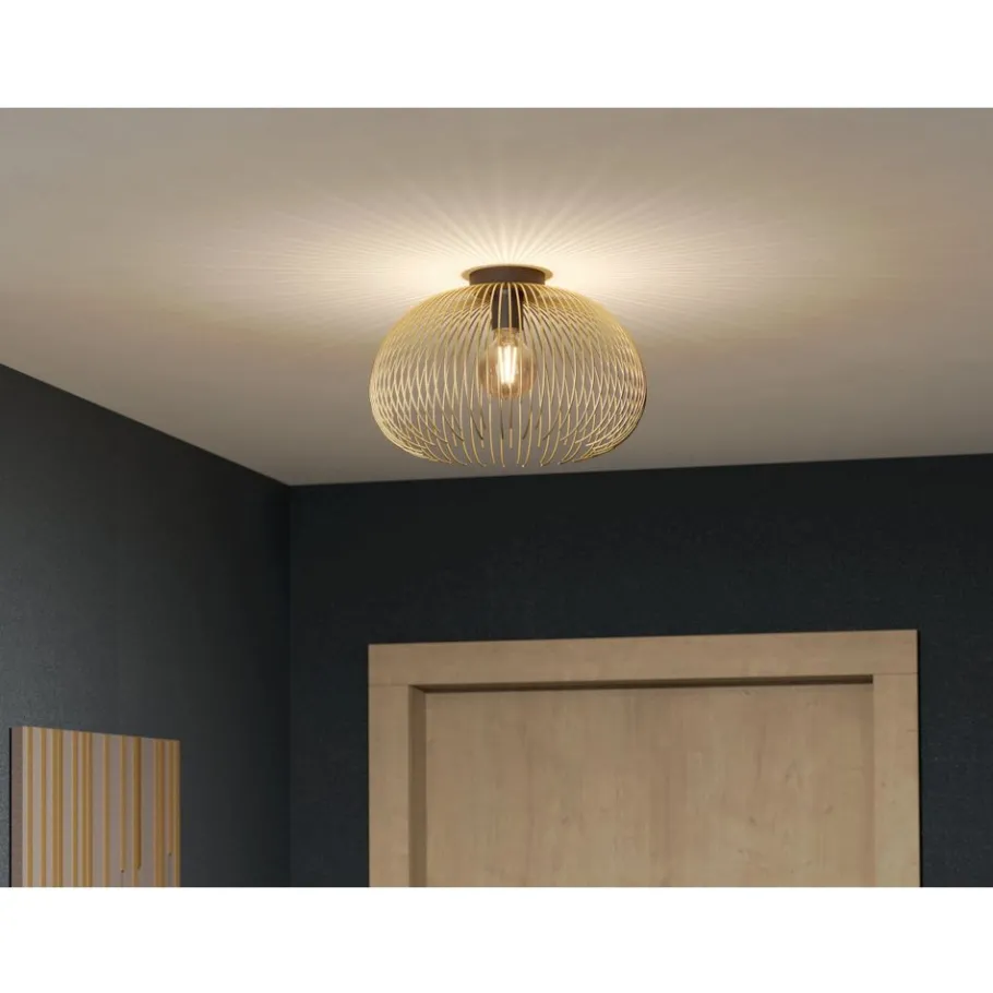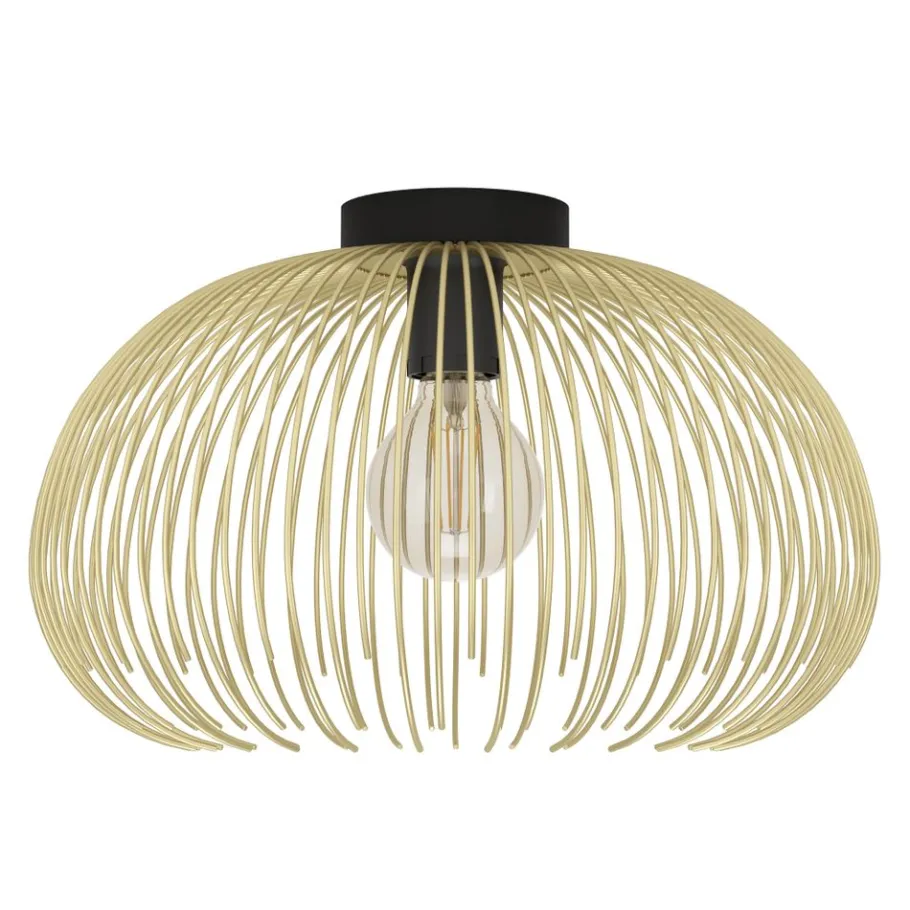 De plafondlamp VENEZUELA bestaat uit een gouden draadkap en een ronde zwarte metalen voet. De draadkap omhult de lamp binnenin met haar harmonieuze rondheid, waardoor een fascinerend spel van licht en schaduw ontstaat zodra het licht wordt ingeschakeld. Deze plafondlamp vult moderne interieurs aan en zorgt voor stijlvolle verlichting in elke ruimte, of het nu gaat om een keuken, woonkamer, slaapkamer of hal. De afgebeelde lichtbron is niet inbegrepen. De lamp is compatibel met elke E27 lamp.
