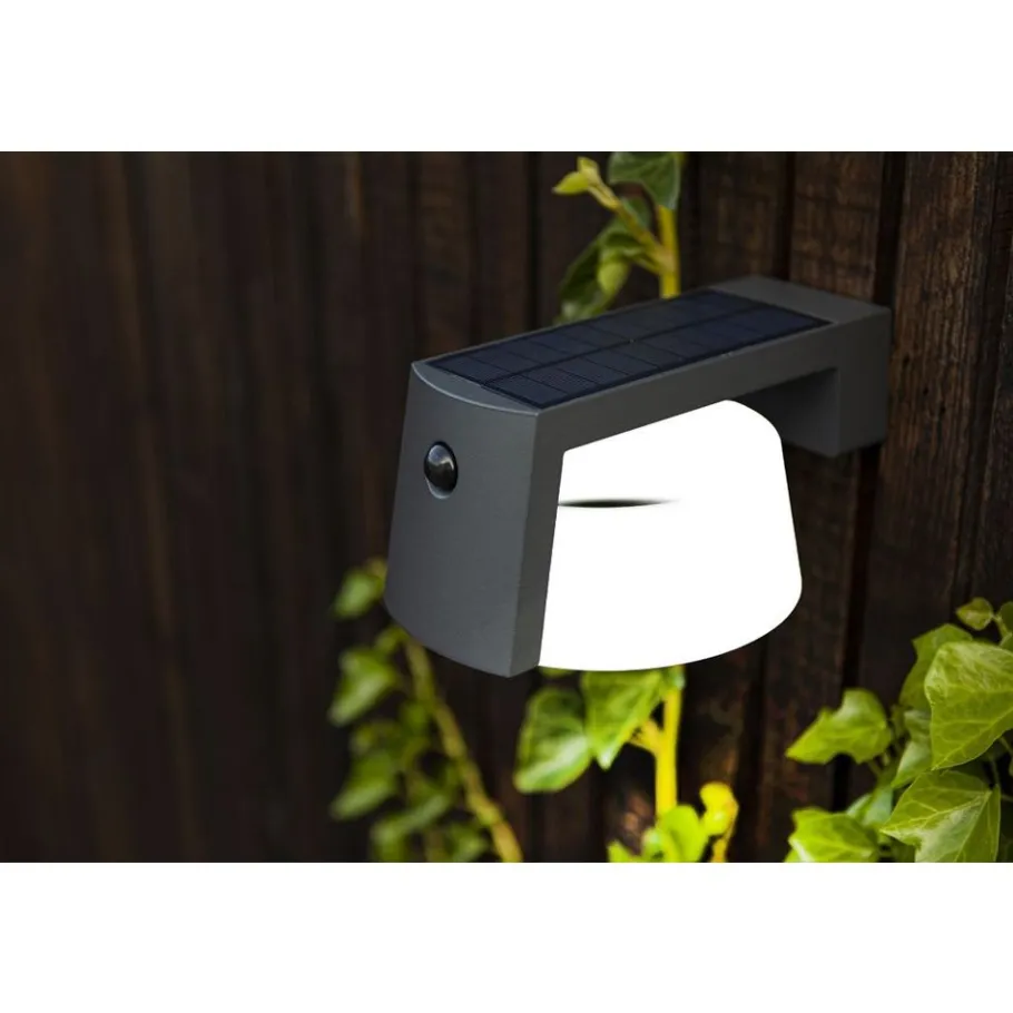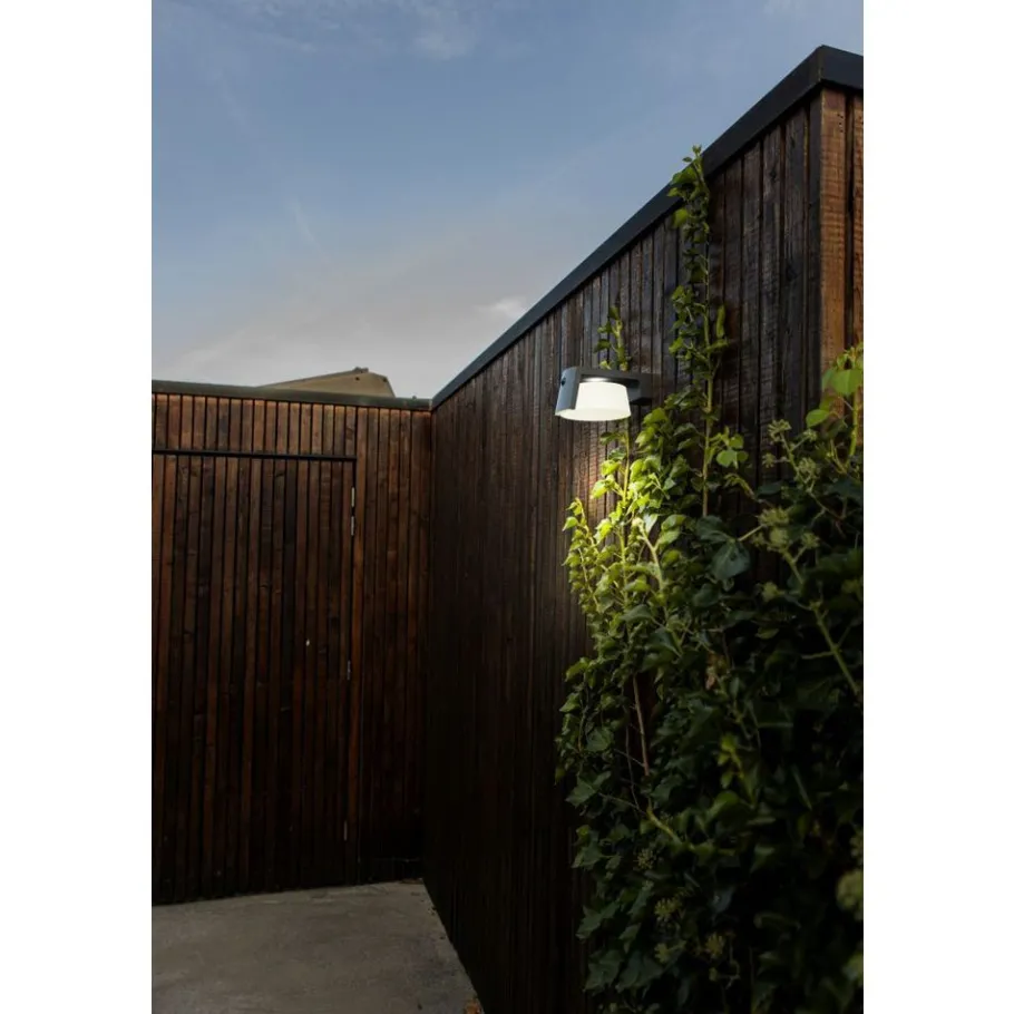 Elegante LED-buitenwandlamp op zonne-energie met downlightfunctie. Uw voordeur of tuinmuur wordt optimaal verlicht dankzij de krachtige lichtbundel. De cilindrische witte kunststof diffusor zorgt voor een mooi homogeen koelwit licht. Geïntegreerde schakelaar met AUTO (met bewegingssensor) – DIM – AAN (permanente verlichting) – UIT-functie.