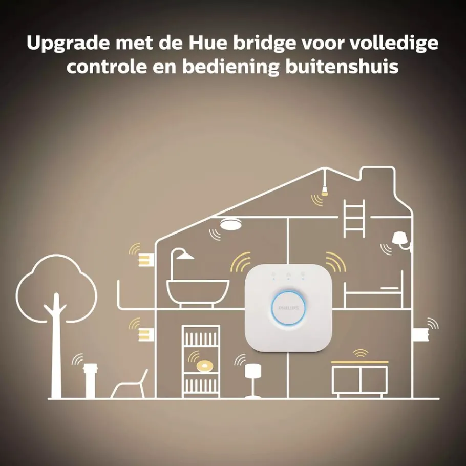 Voeg een Hue Bridge (afzonderlijk verkrijgbaar) toe aan uw slimme LED-lampen en ervaar alle mogelijkheden van Philips Hue. Met een Hue Bridge kunt u tot maar liefst 50 lampen toevoegen om in uw hele huis het perfecte licht in te stellen. Stel routines in om alle slimme verlichting in het huis te automatiseren. Bedien uw lampen ook als u niet thuis bent of voeg accessoires toe, zoals bewegingssensoren en slimme schakelaars.