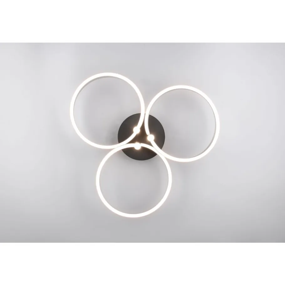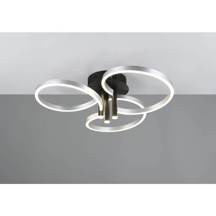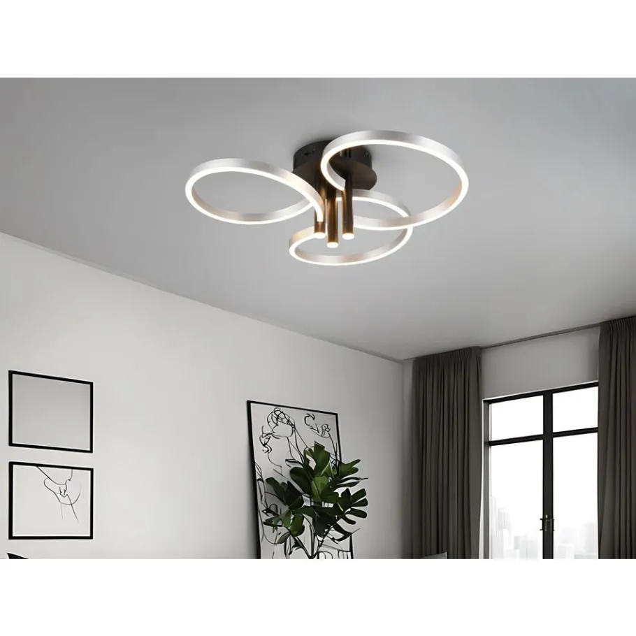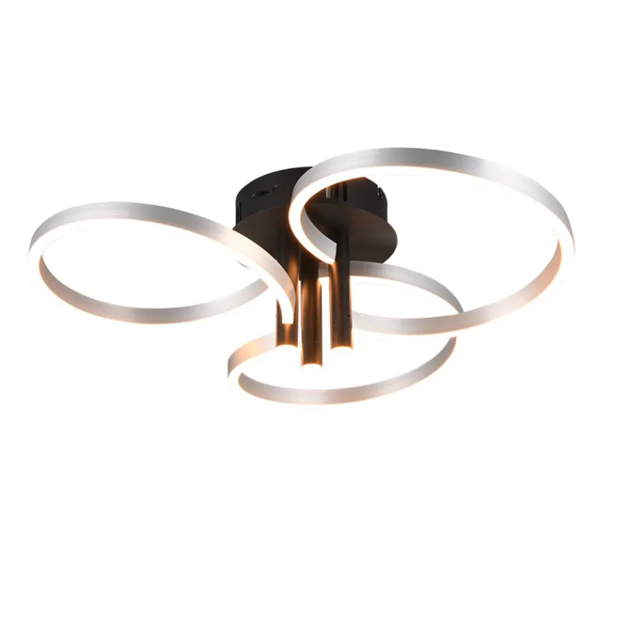 Het hoogtepunt van plafondlamp CARUSO is het unieke ontwerp. Drie elegant in elkaar verstrengelde ringen creëren een dynamische en toch harmonieuze look die onmiddellijk in het oog springt. De plafondlamp is echter niet alleen visueel aantrekkelijk, maar ook technisch indrukwekkend. De helderheid en lichtkleur kunnen geleidelijk worden aangepast met een conventionele lichtschakelaar, zodat de verlichting flexibel kan worden aangepast aan je behoeften en de gewenste stemming. Of het nu helder licht is om geconcentreerd te werken of gedimd licht voor een gezellige sfeer – met de CARUSO heb je altijd volledige controle over het licht. De combinatie van matzwart en aluminiumkleurige accenten geeft de lamp een moderne maar tijdloze stijl die moeiteloos kan worden geïntegreerd in verschillende inrichtingsconcepten. De armatuur is ook voorzien van moderne LED-technologie, die wordt gekenmerkt door een hoge lichtkwaliteit en energie-efficiëntie. Vergeleken met conventionele halogeenlichtbronnen kan tot 80% op de energiekosten worden bespaard. LED lichtbronnen hebben ook een lange levensduur, produceren minder warmte en beschermen het milieu.