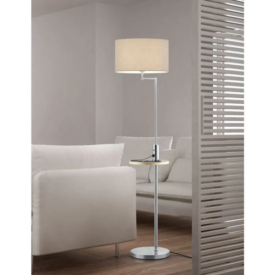 De moderne CLAAS vloerlamp is perfect om in de gang of naast de bank te plaatsen en creëert lichtaccenten die je woonruimte een gezellige sfeer geven. De vloerlamp heeft ook een klein houten tafeltje en een USB-poort met oplaadfunctie, waardoor hij ideaal is om bijvoorbeeld je mobiele telefoon naast de bank te leggen en tegelijkertijd op te laden. De praktische lamp is 160 cm hoog en heeft een projectie van 40 cm. De combinatie van mat nikkel en de grijze stoffen kap, samen met de houten tafel, geeft de lamp een moderne uitstraling. Het gebruik van LED lichtbronnen wordt aanbevolen voor energiebesparende verlichting. Deze vormen een ideaal alternatief voor conventionele halogeenlichtbronnen en bieden een hoge lichtkwaliteit en energiebesparingen tot 80%. Met LED lichtbronnen profiteert u ook van een lange levensduur en een lage warmteontwikkeling, terwijl het milieu wordt beschermd.