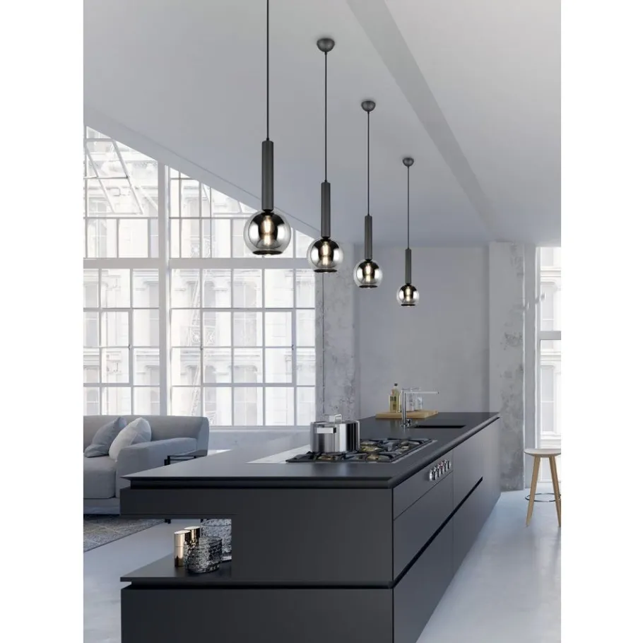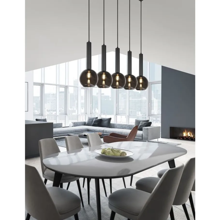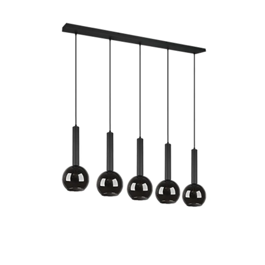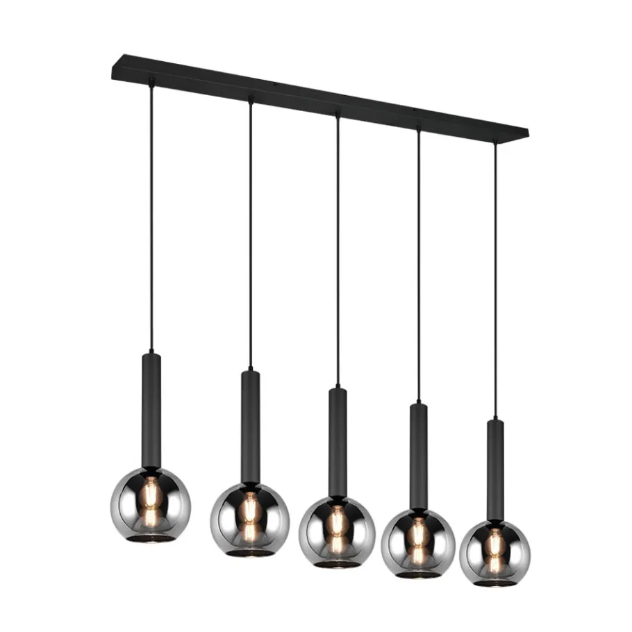 Tijdloos, strak en toch karakteristiek . De moderne hanglamp CLAYTON trekt iedereens aandacht door de combinatie van elegante glazen kappen en donker metaal. De ronde vorm van de vijf glazen kappen geeft het licht op een bijzondere manier af aan de omgeving en schept zo een gezellige sfeer. Geplaatst boven de woonkamertafel of in het midden boven de eettafel, komt de lamp goed tot haar recht en creëert nieuwe favoriete plekjes in uw huis. Het bedampte chroomglas en mat zwart metaal passen zich moeiteloos aan elke woonstijl en kleurconcept aan en zijn eenvoudig te combineren. Voor een energiebesparende verlichting is het gebruik van een ledlichtbron aanbevolen. Deze zijn een optimaal alternatief voor gewone halogeenlampen en staan voor een hoge lichtkwaliteit en een energiebesparing van tot 80%. Bovendien profiteert u bij ledlichtbronnen van een lange levensduur, een geringe warmteontwikkeling en spaart tegelijkertijd het milieu.