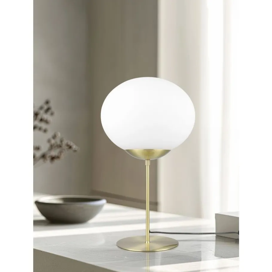 De FOMENTO tafellamp creëert zachte accenten op een dressoir of nachtkastje. De elegante, ellipsvormige lampkop van opaalglas geeft het armatuur een speciale touch en verspreidt het licht op aangename wijze in de omgeving. De combinatie van mat messing en wit glas creëert tegelijkertijd een vleugje luxe en verfijning. Het gebruik van LED lichtbronnen wordt aanbevolen voor energiebesparende verlichting. Deze vormen een ideaal alternatief voor conventionele halogeenlichtbronnen en bieden een hoge lichtkwaliteit en energiebesparingen tot 80%. Met LED lichtbronnen profiteert u ook van een lange levensduur en een lage warmteontwikkeling, terwijl het milieu wordt beschermd.