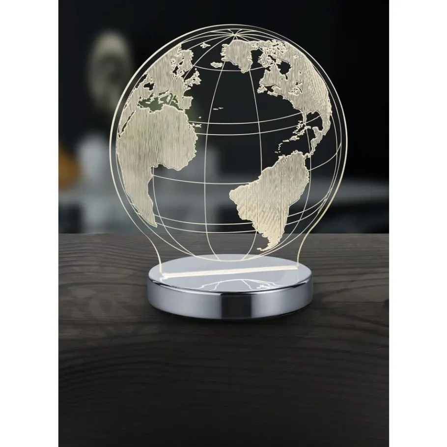 De tafellamp met 3D-effect is niet zozeer voor gerichte verlichting, maar een echt decoratief geheim wapen. De GLOBE tafellamp met globe-design moet prominent in het interieur worden geplaatst, want ze is een hoogtepunt bij het aan- en uitschakelen. De lichtkleur kan ook worden aangepast met de conventionele snoerschakelaar. Met korte in- en uitschakelprocessen kan de lichtkleur worden aangepast in stappen van 3000, 4000 of 5000 Kelvin. De lampkop van helder acryl is gemonteerd op een chroomkleurige voet en is 20 cm hoog en 17,5 cm breed. De geïntegreerde LED-lichtbron straalt een krachtige 400 lumen of 7 watt uit.