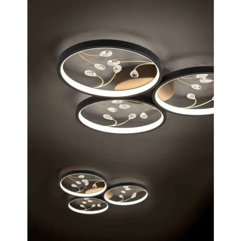 De drie lichtcirkels op een rij van de plafondlamp GROOVY toveren dat extra iets in uw woonkamer. De fijne glazen elementen binnen de cirkels zorgen voor een elegante toets en worden een echt decoratief element aan uw plafond. Via een geïntegreerde SWITCH-dimmer laat de helderheid van de ingebouwde leds zich via een gewone schakelaar in drie niveaus regelen. Het perfect gevormde uitzicht in mat zwart gaat door zijn strakheid op in vele inrichtingsstijlen. Daarnaast beschikt de lamp over een moderne ledtechnologie die zich onderscheidt met een hoge lichtkwaliteit en energie-efficiëntie. In vergelijking met gewone halogeenlampen kan tot 80% bespaard worden op de energiekosten. Bovendien profiteert u bij ledlichtbronnen van een lange levensduur, een geringe warmteontwikkeling en spaart tegelijkertijd het milieu.