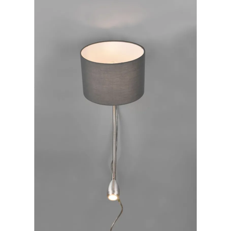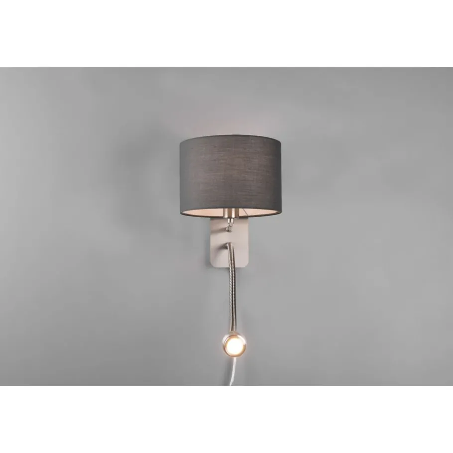 Lampen met stoffen kappen zorgen voor een sfeervolle stemming en behaaglijkheid. Via de stoffen kap wordt het licht zacht aan de omgeving afgegeven en wordt gezelligheid gecreëerd. De muurlamp HOTEL is geschikt als alternatief op het klassieke nachtlampje. De praktische leesarm kan immers door de Flex-Arm individueel gericht worden. Door twee schakelaars aan de kant van de lamp kunnen de hoofdkap en de leesarm apart van elkaar in- en uitgeschakeld worden. De strakke vorm van de lamp zorgt voor een aangename woonsfeer en geldt als klassieker in de decoratieve verlichting. Door de smaakvolle combinatie van de grijze kap met mat nikkel creëert de lamp een stijlvolle omgeving. Voor een energiebesparende verlichting is het gebruik van een ledlichtbron aanbevolen. Deze zijn een optimaal alternatief voor gewone halogeenlampen en staan voor een hoge lichtkwaliteit en een energiebesparing van tot 80%. Bovendien profiteert u bij ledlichtbronnen van een lange levensduur, een geringe warmteontwikkeling en spaart tegelijkertijd het milieu.