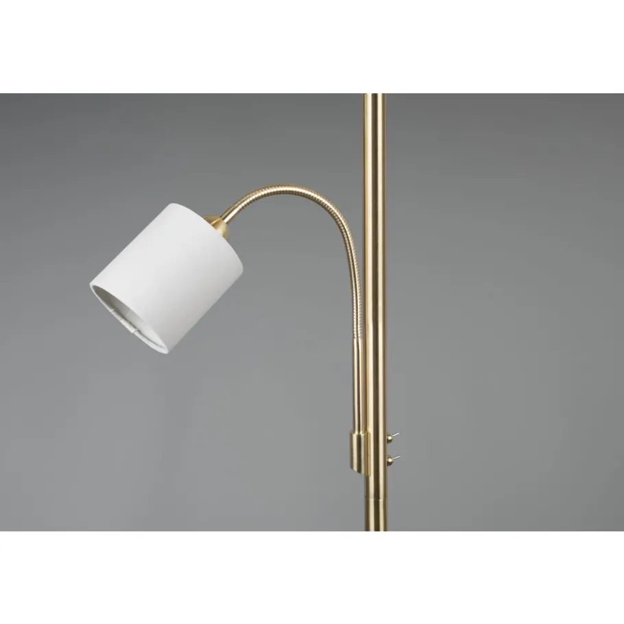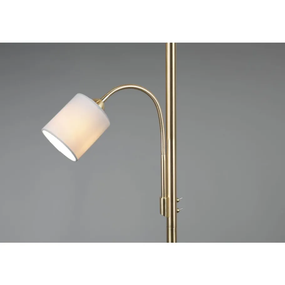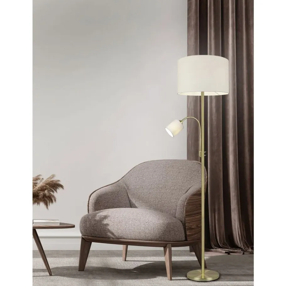 Lampen met stoffen kappen zorgen voor een sfeervolle stemming en behaaglijkheid. Via de stoffen kap wordt het licht zacht aan de omgeving afgegeven en wordt gezelligheid gecreëerd. Idealiter krijgt de staande lamp HOTEL een plaats naast de sofa, want voor het best mogelijke licht zorgt naast de hoofdlichtbron een flexibele leesarm die apart geschakeld kan worden. De strakke vorm zorgt voor een aangename woonsfeer en geldt als klassieker in de decoratieve verlichting. Door de smaakvolle combinatie van de beige kap met messing creëert de lamp een stijlvolle omgeving. Voor een energiebesparende verlichting is het gebruik van een ledlichtbron aanbevolen. Deze zijn een optimaal alternatief voor gewone halogeenlampen en staan voor een hoge lichtkwaliteit en een energiebesparing van tot 80%. Bovendien profiteert u bij ledlichtbronnen van een lange levensduur, een geringe warmteontwikkeling en spaart tegelijkertijd het milieu.