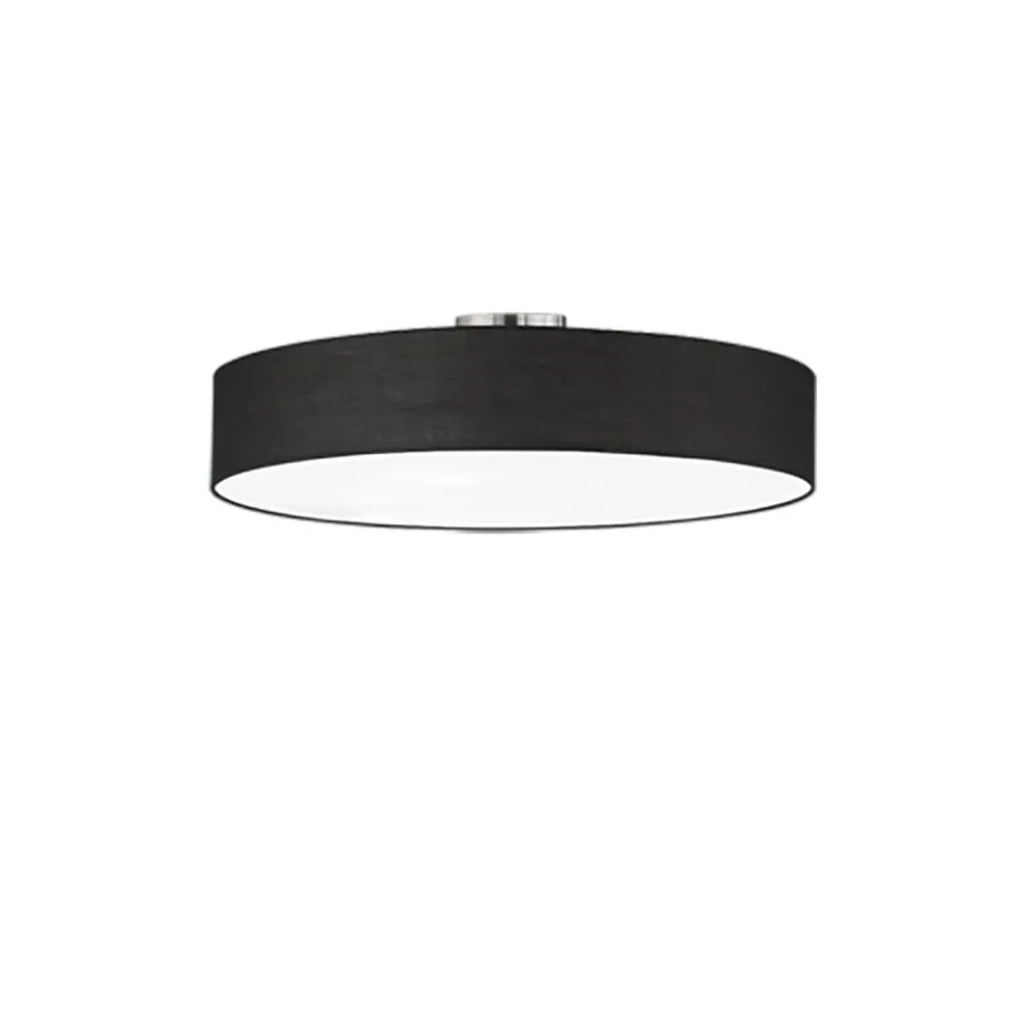 De HOTEL plafondlamp maakt indruk met zijn combinatie van eenvoudige elegantie en gezellig karakter en geeft moderne woonruimtes een individuele look met een diameter van 65 cm. De zwarte stoffen kap creëert een sfeervol spel van licht en schaduw en voegt een echte blikvanger toe aan woonkamers, slaapkamers of entreezones. De plafondlamp met vijf lampen kan met of zonder afdekking worden gemonteerd voor een verblindingsvrij zicht en is 17 cm hoog met de chroomkleurige ophanging. De vijf E27-fittingen kunnen worden uitgerust met lichtbronnen van maximaal 60W.