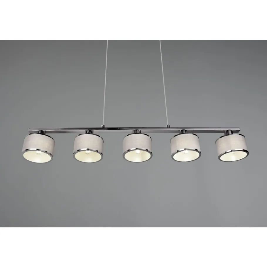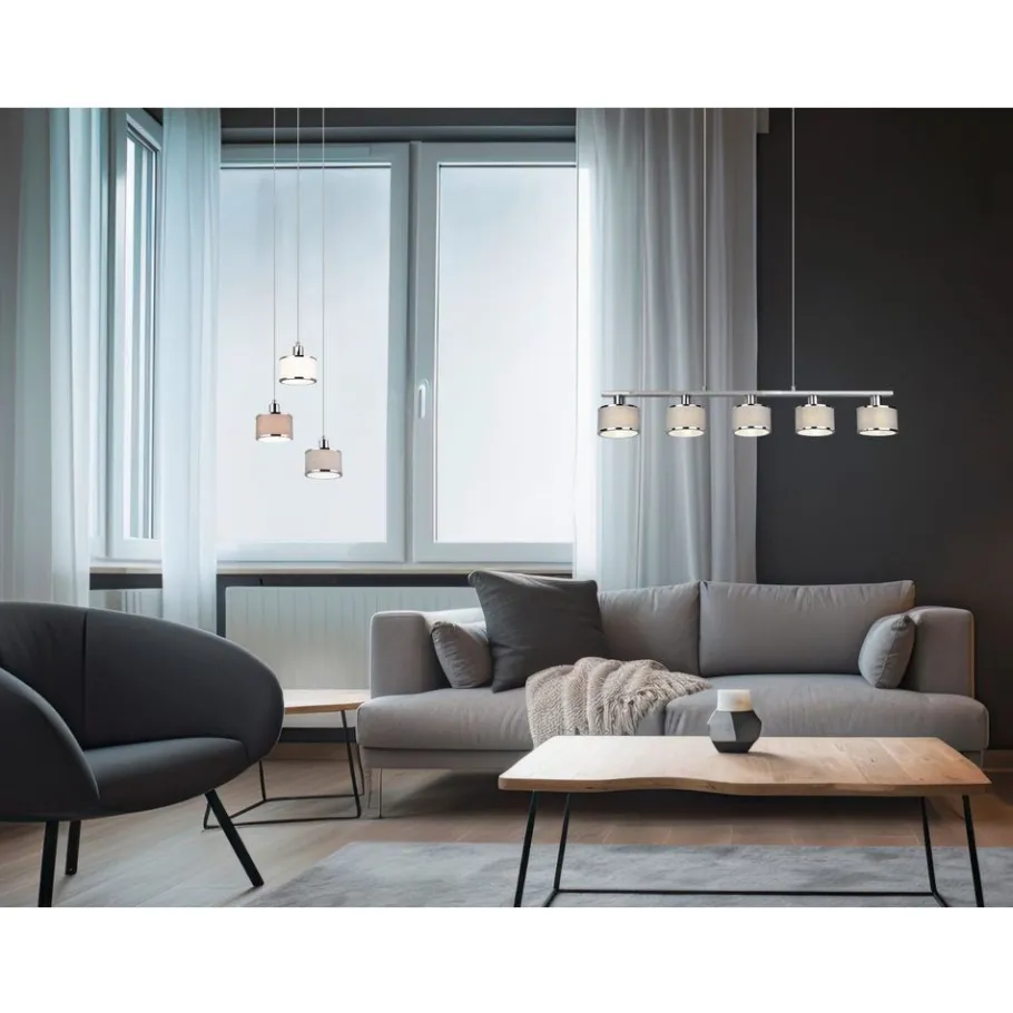 De armatuurserie KAPRUN – warme flair gecombineerd met licht! De geslaagde combinatie van cilindrische vormen en hoogwaardig textielweefsel creëert een sfeer van elegantie en lichtharmonie. De vijflamps hanglamp zorgt ook voor warme reflecties en een gezellig, uitnodigend lichtspel boven een eettafel of aanrecht. De chique kleurnuances in chroom en grijs geven je huis een individueel tintje en onderstrepen het wow-effect. Het gebruik van LED lichtbronnen wordt aanbevolen voor energiebesparende verlichting. Deze vormen een ideaal alternatief voor conventionele halogeenlichtbronnen en bieden een hoge lichtkwaliteit en energiebesparingen tot 80%. Met LED lichtbronnen profiteert u ook van een lange levensduur en een lage warmteontwikkeling, terwijl het milieu wordt beschermd.