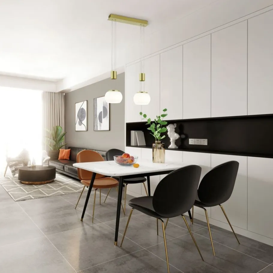 De hanglamp MADISON zorgt met haar moderne vormtaal voor eenvoudige elegantie. De sierlijke glazen kappen kunnen individueel in de hoogte worden versteld en zetten de gewenste lichtaccenten. Midden boven de eettafel geplaatst komt de pendellamp als centraal element bijzonder goed tot gelding. De geïntegreerde SWITCH-dimmer maakt bovendien verschillende helderheidsniveaus mogelijk en zorgt voor passende lichtstemmingen. Dankzij het kleurenschema in mat messing met witte glazen schermen zet de lamp moderne accenten en kan met aanwezig meubilair gecombineerd worden. Daarnaast beschikt de lamp over een moderne ledtechnologie die zich onderscheidt met een hoge lichtkwaliteit en energie-efficiëntie. In vergelijking met gewone halogeenlampen kan tot 80% bespaard worden op de energiekosten. Bovendien hebben ledlampen een lange levensduur, produceren minder warmte en zijn milieuvriendelijk.