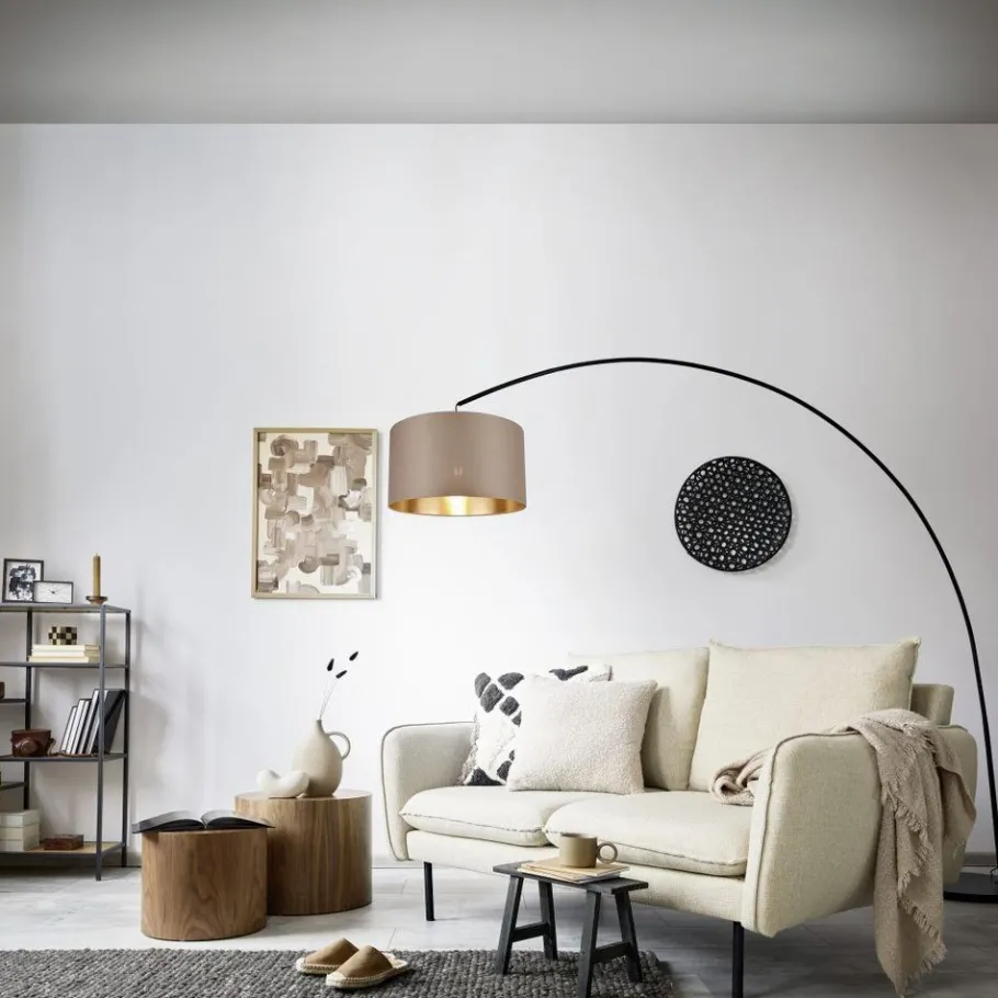 Gebogen armaturen geven je huis een modern tintje en stralen tegelijkertijd een aangenaam gevoel van rust uit. Dit is ook het geval met de MANSUR vloerlamp, die een warme sfeer creëert met zijn slanke, gebogen frame en eenvoudige kapvorm. De klassieke stoffen kap richt het licht naar boven en naar beneden en creëert daaronder een prachtig lichteiland waar je kunt lezen of ontspannen. De MANSUR is bijzonder geschikt voor grote woonkamers, omdat hij veel ruimte inneemt en effectief is als decoratief element op zich. De stoffen kap is taupe aan de buitenkant en goudkleurig aan de binnenkant. Het frame en de voet in mat zwart ronden het armatuur perfect af. Het gebruik van LED lichtbronnen wordt aanbevolen voor energiebesparende verlichting. Deze vormen een ideaal alternatief voor conventionele halogeenlichtbronnen en bieden een hoge lichtkwaliteit en energiebesparingen tot 80%. Met LED lichtbronnen profiteert u ook van een lange levensduur en een lage warmteontwikkeling, terwijl het milieu wordt beschermd.