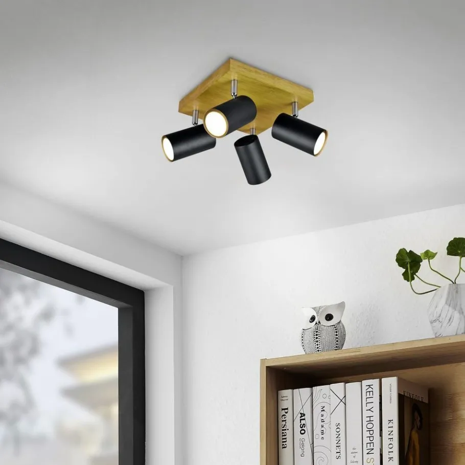 Perfect en variabel licht! De MARLEY-spots zijn niet alleen praktisch op het gebied van vorm en functie, maar vooral één ding: minimalistisch! De lamp heeft een subtiel design en overtuigt met haar hoogwaardige afwerking. De spots van de viervlammige plafondlamp zijn vrij beweegbaar en kunnen naar wens individueel gericht worden. In de keuken, hal of in de woonzone: de MARLEY kan veelzijdig gebruikt worden en kan mooi gecombineerd worden met verschillende interieurstijlen. De moderne combinatie uit hout en metaal in mat zwart zorgt voor gezelligheid en is absoluut in de mode. Voor een energiebesparende verlichting is het gebruik van een ledlichtbron aanbevolen. Deze zijn een optimaal alternatief voor gewone halogeenlampen en staan voor een hoge lichtkwaliteit en een energiebesparing van tot 80%. Bovendien profiteert u bij ledlichtbronnen van een lange levensduur, een geringe warmteontwikkeling en spaart tegelijkertijd het milieu.