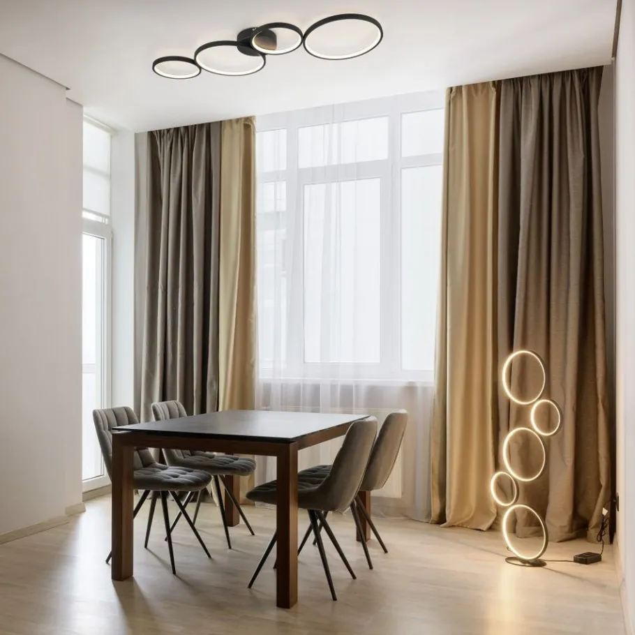 Met zijn vijf gestapelde ringen van verschillende diameters is de RONDO vloerlamp een echte blikvanger. De vloerlamp heeft een geïntegreerde dimmer die wordt bediend via de snoerschakelaar. Hiermee kun je flexibel de helderheid regelen van de LED’s die aan de binnenkant van elke cirkel zijn geïnstalleerd. De 115 cm hoge vloerlamp is een echt decoratief element en verfraait stijlvol elke woonruimte. Dankzij de mat zwarte kleur kan de lamp met vele inrichtingsstijlen gecombineerd worden. Daarnaast beschikt de lamp over een moderne ledtechnologie die zich onderscheidt met een hoge lichtkwaliteit en energie-efficiëntie. In vergelijking met gewone halogeenlampen kan tot 80% bespaard worden op de energiekosten. Bovendien hebben ledlampen een lange levensduur, produceren minder warmte en zijn milieuvriendelijk.