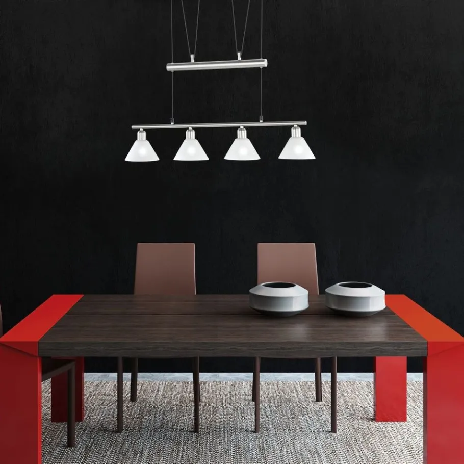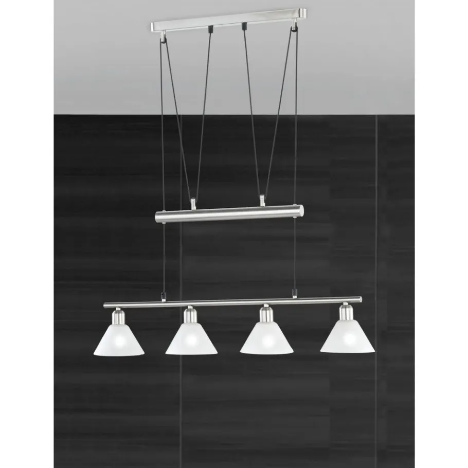 De in hoogte verstelbare STAMINA lamp zorgt met zijn licht voor een aangename verlichting in je woonruimte en is bijzonder geschikt voor gebruik boven de eettafel of iets dergelijks. De breedte is 80cm en de hoogte is verstelbaar van 80 tot 180cm. Het aantrekkelijke silhouet samen met het frame in mat nikkel en de glazen lampenkappen in opaalwit creëren een elegante look. Voor een energiebesparende verlichting is het gebruik van een ledlichtbron aanbevolen. Deze zijn een optimaal alternatief voor gewone halogeenlampen en staan voor een hoge lichtkwaliteit en een energiebesparing van tot 80%. Bovendien profiteert u bij ledlichtbronnen van een lange levensduur, een geringe warmteontwikkeling en spaart tegelijkertijd het milieu.