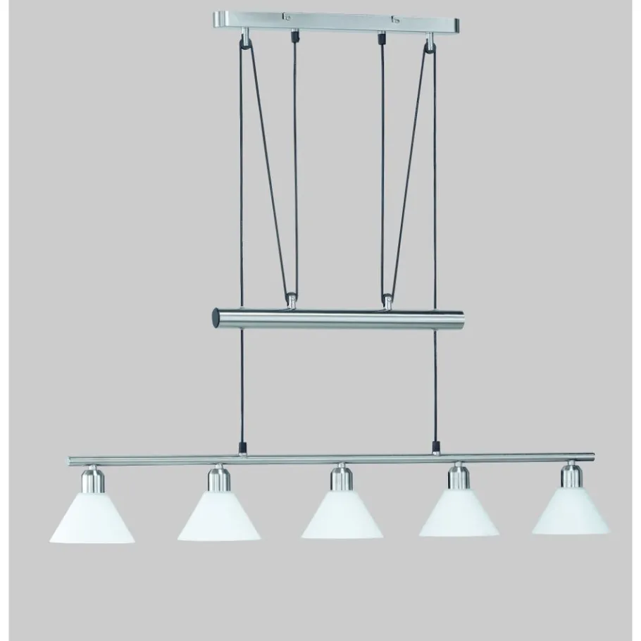 De in hoogte verstelbare STAMINA lamp zorgt met zijn licht voor een aangename verlichting in je woonruimte en is bijzonder geschikt voor gebruik boven de eettafel of iets dergelijks. De breedte is 102cm en de hoogte is verstelbaar van 80 tot 180cm. Het aantrekkelijke silhouet samen met het frame in mat nikkel en de glazen lampenkappen in opaalwit creëren een elegante look. Voor een energiebesparende verlichting is het gebruik van een ledlichtbron aanbevolen. Deze zijn een optimaal alternatief voor gewone halogeenlampen en staan voor een hoge lichtkwaliteit en een energiebesparing van tot 80%. Bovendien profiteert u bij ledlichtbronnen van een lange levensduur, een geringe warmteontwikkeling en spaart tegelijkertijd het milieu.