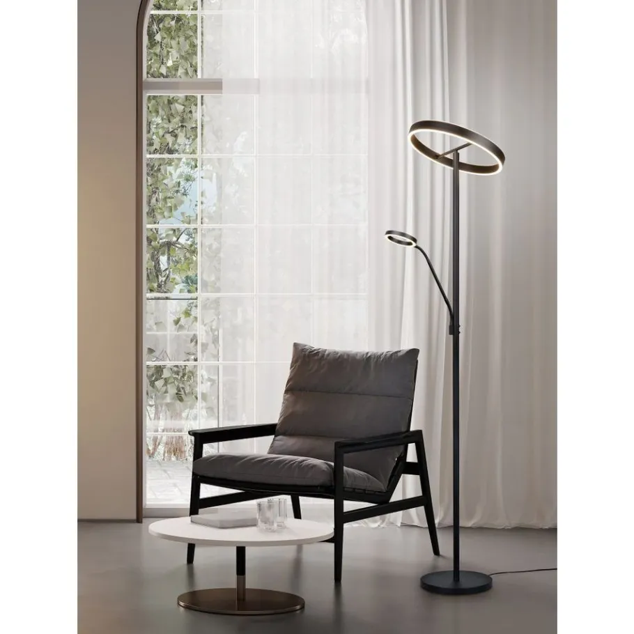 De WILLIS vloerlamp maakt indruk met zijn elegante ontwerp en verfijnde functionaliteit. De ringvormige lampkop en de flexibele leesarm bieden een breed scala aan verlichtingsopties die kunnen worden aangepast aan individuele behoeften. Beide lichtbronnen kunnen apart worden geschakeld, terwijl de lichtkleur en helderheid individueel kunnen worden aangepast. Dit maakt precieze controle over de verlichting mogelijk, of het nu voor gezellige avonden op de bank is of als discrete achtergrondverlichting. De moderne look in mat zwart geeft de lamp een tijdloze uitstraling die moeiteloos past in verschillende interieurstijlen. De armatuur is ook voorzien van moderne LED-technologie, die wordt gekenmerkt door een hoge lichtkwaliteit en energie-efficiëntie. Vergeleken met conventionele halogeenlichtbronnen kan tot 80% op de energiekosten worden bespaard. LED lichtbronnen hebben ook een lange levensduur, produceren minder warmte en beschermen het milieu.