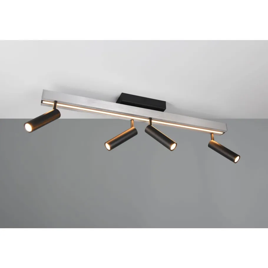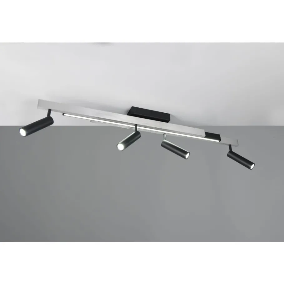 Veelzijdige verlichting in een stijlvol design – De plafondlamp ZENO maakt indruk met drie parallelle, langwerpige elementen die eenvoudig uit elkaar getrokken kunnen worden om het licht aan te passen aan jouw behoeften en de ruimte. Daarnaast bieden vier verplaatsbare spots nog meer opties voor een gericht lichtontwerp in je woonruimte. Met de meegeleverde afstandsbediening kun je de lichtkleur en helderheid eenvoudig op afstand regelen. De combinatie van geborsteld aluminium en mat zwart metaal geeft de lamp een elegante en moderne uitstraling. De armatuur is ook voorzien van moderne LED-technologie, die wordt gekenmerkt door een hoge lichtkwaliteit en energie-efficiëntie. Vergeleken met conventionele halogeenlichtbronnen kan tot 80% op de energiekosten worden bespaard. LED lichtbronnen hebben ook een lange levensduur, produceren minder warmte en beschermen het milieu.