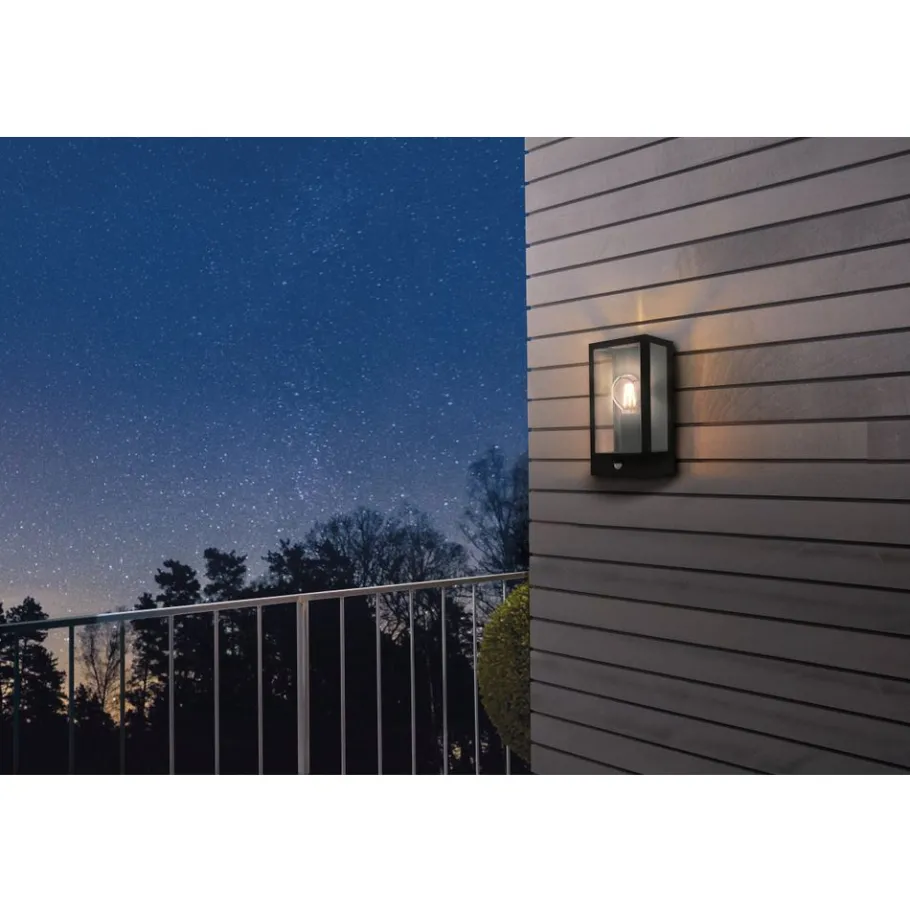 De buitenwandlamp ALAMONTE bestaat uit een zwarte metalen behuizing en heldere glazen ruiten waardoor de lamp direct zichtbaar is. De wandlamp is ook uitgerust met een bewegingsdetector en schakelt automatisch het licht in om slecht zichtbare zones te verlichten en ongewenste bezoekers af te schrikken. De geïntegreerde schemersensor meet de omgevingshelderheid en schakelt het licht alleen in als het echt nodig is. Spatwaterdicht (IP44), kan deze buitenlamp zonder problemen buiten worden gebruikt, waar ze een perfecte aanvulling vormt op moderne buitenruimtes. De afgebeelde lichtbron is niet inbegrepen. De sensorarmatuur is compatibel met elke E27 lamp.