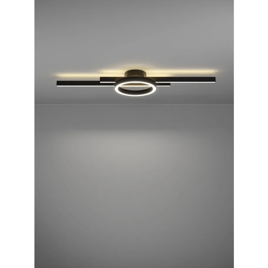 Deze Amandolo plafondlamp is gemaakt van zwart aluminium, zwart staal en witte kunststof. Hij meet 77cm x 24cm x 6,5cm. De geïntegreerde LED lichtbron heeft RGB licht, alsook regelbaar wit licht naar wens. De lichtstroom bedraagt maximaal 3000 lumen, maar is dimbaar. Afstandsbediening inclusief.