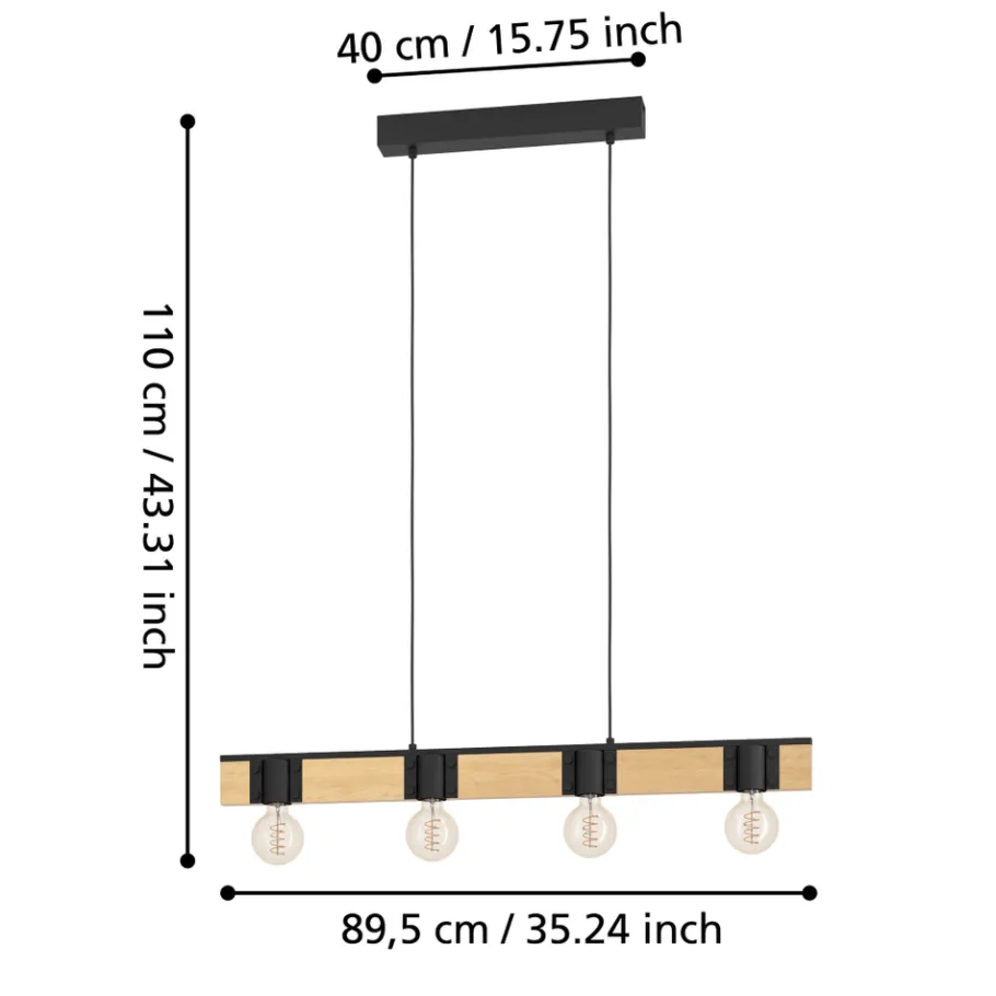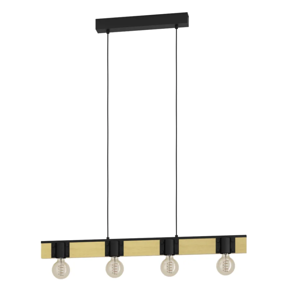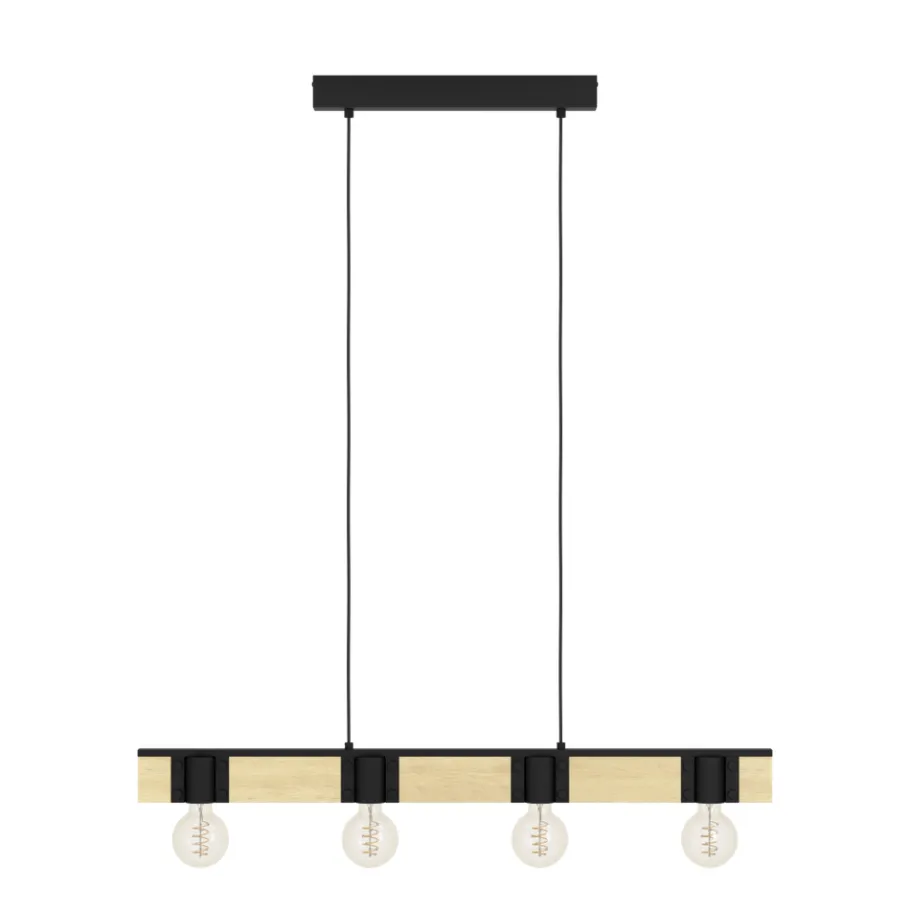 Deze BAILRIGG hanglamp heeft een zwarte metalen voet met daaraan een houten balk met vier lichtbronnen in stalen kapjes. Het zwarte staal vult de moderne maar natuurlijke uitstraling van het hout aan en past naadloos in een modern interieur. De lamp biedt gezellige verlichting voor elke ruimte, zowel op in de woonkamer als boven de eettafel. Het product vereist vier E27 lichtbronnen die niet zijn inbegrepen.