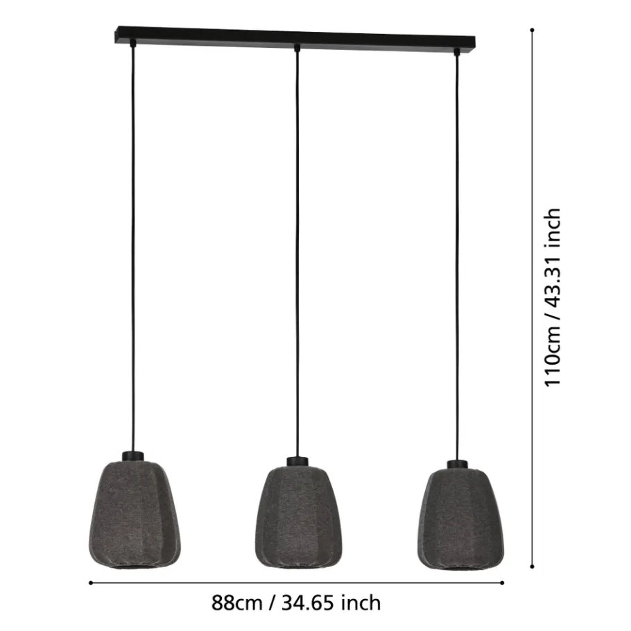 De BARLASTON hanglamp bestaat uit een voet en drie kloklampenkappen in gemêleerde zwarte stof. Het ziet er geweldig uit in elke kamer met warme tinten en een moderne inrichting. Eenmaal aangestoken met de E27-lampen van uw keuze, zal het een zacht en aangenaam licht verspreiden.