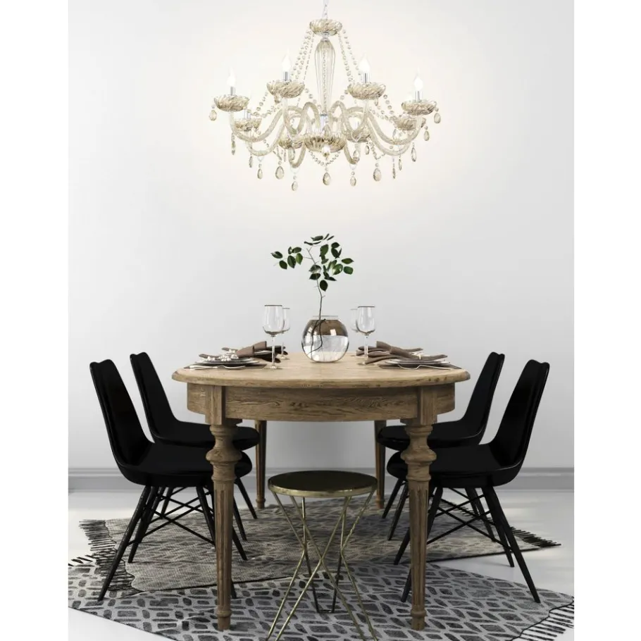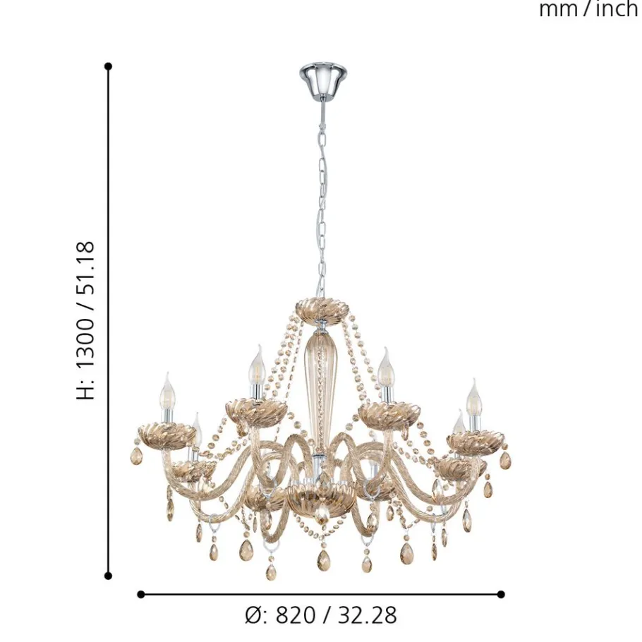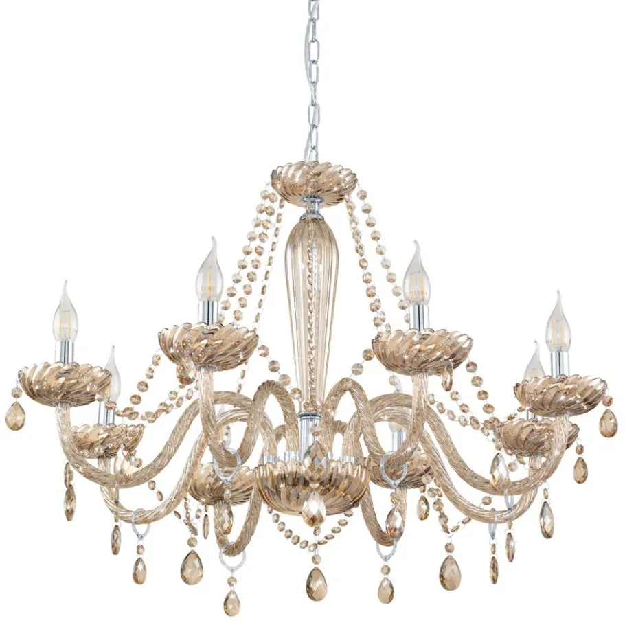 De kroonluchter BASILANO is gemaakt van cognackleurig glas met chroomkleurige metalen elementen. De acht gebogen lamparmen zijn gecombineerd met een veelheid aan waardevolle glaskristallen en vullen het klassieke ontwerp van de kroonluchter slim aan. De kristallen zorgen bovendien voor een fonkelende en edele uitstraling zodra de kroonluchter wordt aangezet. Met zijn diameter van 82 cm past deze elegante en indrukwekkende kroonluchter perfect in een moderne interieurstijl en biedt hij een sfeervol middelpunt voor elke ruimte – of het nu in de woonkamer, slaapkamer of eetkamer boven de tafel is. De lichtbronnen zijn niet ingebrepen. Het armatuur is geschikt voor alle lampen met een E14 fitting.