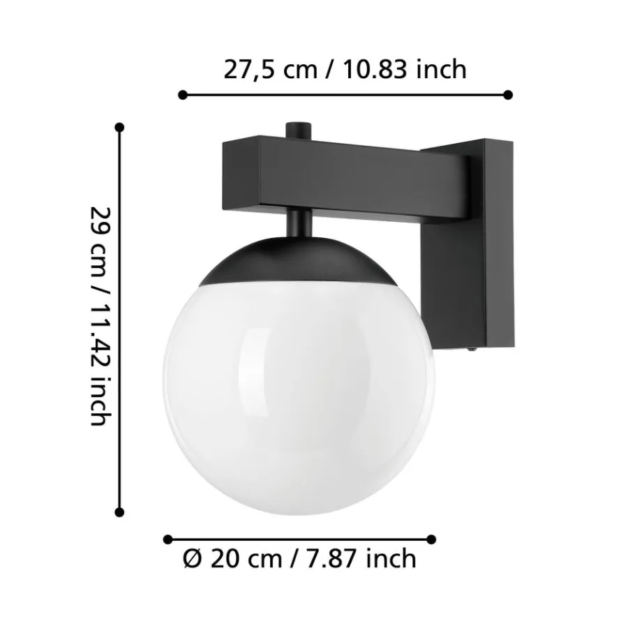 De BUFALATA wandlamp voor buiten bestaat uit een zwarte metalen staaf gecombineerd met een witte kunststof lichtbol. De wandlamp is spatwaterdicht (IP44) en kan dus zonder angst buiten gebruikt worden. Dankzij het strakke design past hij in elke moderne buitenruimte: de ideale buitenwandlamp voor aan de muur van het huis. De lamp is niet inbegrepen. Het buitenarmatuur is compatibel met elke E27-lamp.