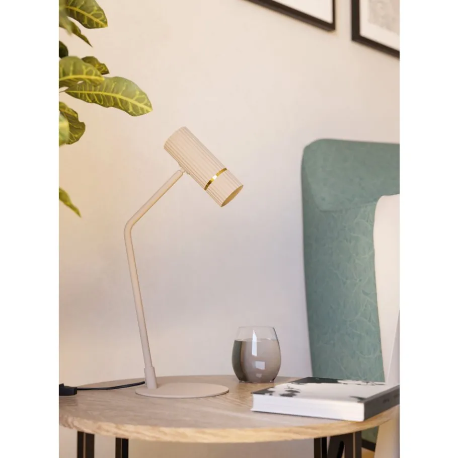 De CAMINIA tafellamp in zachte zandkleur met gouden detailring zorgt met zijn zachte ontwerp voor een eigentijdse toets aan de klassieke bureaulamp. Deze tafellamp kan op een bijzettafeltje of als bureaulamp gebruikt worden. In de tafellamp zit een GU10 lichtbron inclusief met een warme lichtkleur, indien je deze graag wat objectiever wilt om als leeslamp te gebruiken kan je deze dus makkelijk wisselen naar eentje met een wittere lichtkleur.